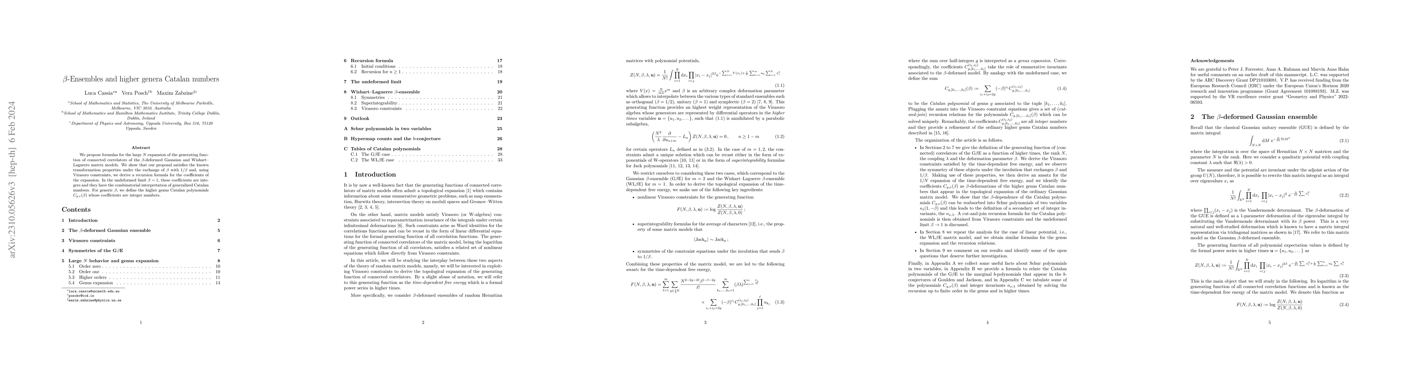 This paper proposes formulas for the large $N$ expansion of connected correlators in $\beta$-deformed matrix models, showing they match known transformation properties. The coefficients in the undeformed limit correspond to generalized Catalan numbers, while for generic $\beta$, it introduces higher genus Catalan polynomials $C_{g,\nu}(\beta)$.