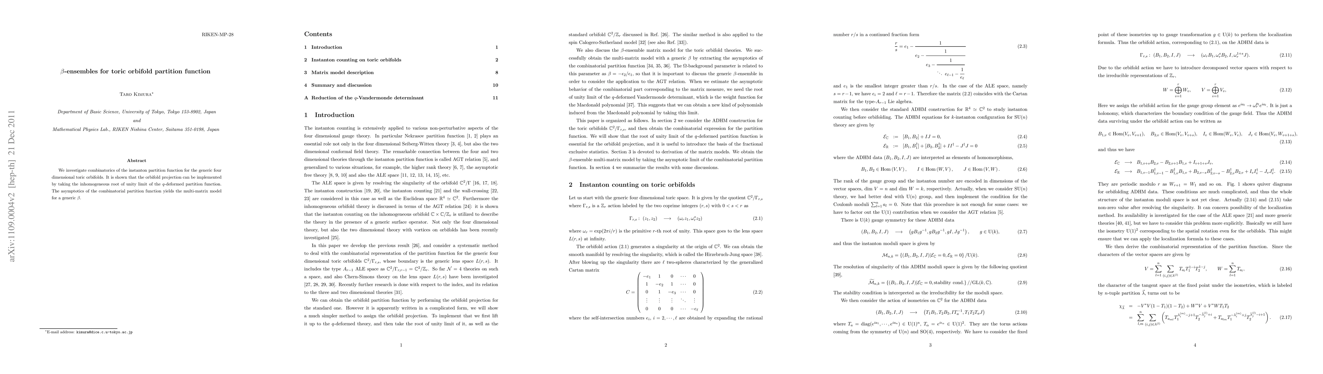 This paper explores the combinatorial aspects of the instanton partition function for four-dimensional toric orbifolds, demonstrating that the orbifold projection is achieved through the inhomogeneous root of unity limit of the q-deformed partition function, leading to a multi-matrix model for a generic β.