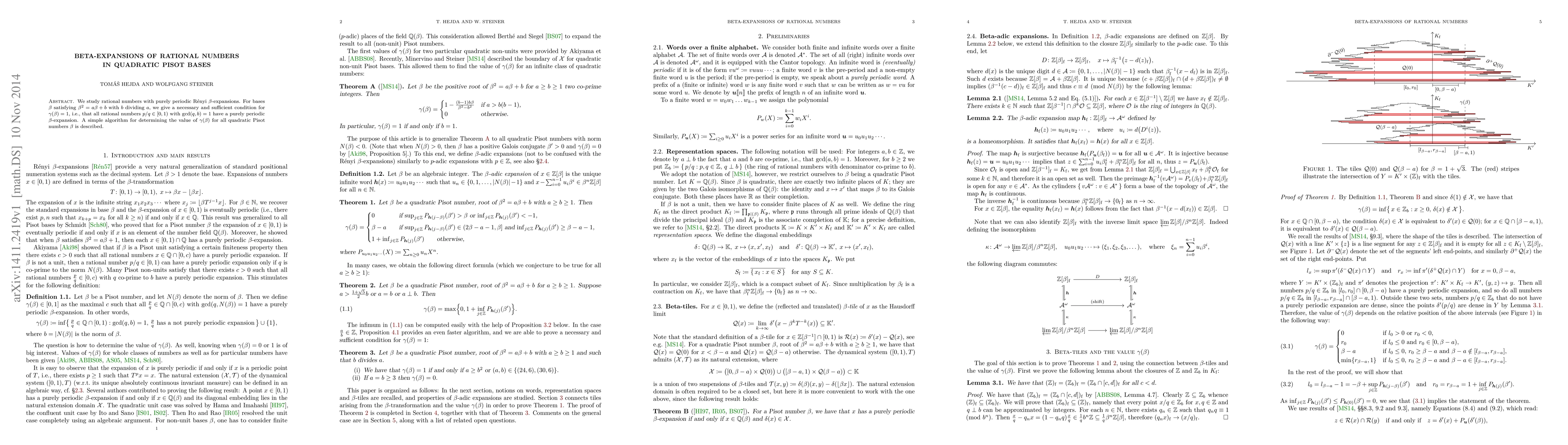We study rational numbers with purely periodic R\'enyi $\beta$-expansions. For bases $\beta$ satisfying $\beta^2=a\beta+b$ with $b$ dividing $a$, we give a necessary and sufficient condition for $\gamma(\beta)=1$, i.e., that all rational numbers $p/q\in[0,1)$ with $\gcd(q,b)=1$ have a purely periodic $\beta$-expansion. A simple algorithm for determining the value of $\gamma(\beta)$ for all quadratic Pisot numbers $\beta$ is described.