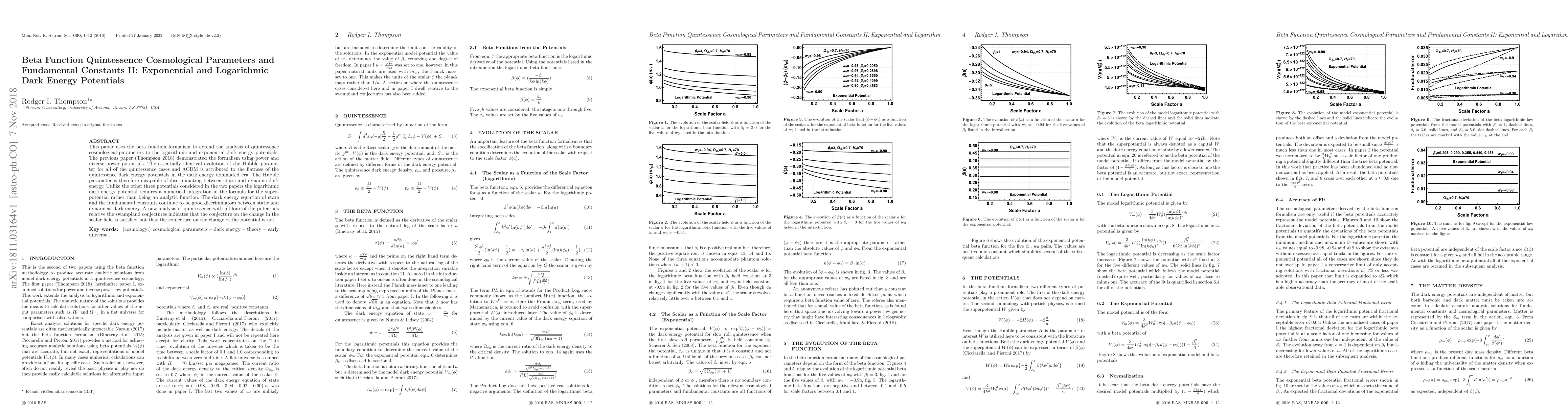 This paper uses the beta function formalism to extend the analysis of quintessence cosmological parameters to the logarithmic and exponential dark energy potentials. The previous paper (Thompson 2018) demonstrated the formalism using power and inverse power potentials. The essentially identical evolution of the Hubble parameter for all of the quintessence cases and LambdaCDM is attributed to the flatness of the quintessence dark energy potentials in the dark energy dominated era. The Hubble parameter is therefore incapable of discriminating between static and dynamic dark energy. Unlike the other three potentials considered in the two papers the logarithmic dark energy potential requires a numerical integration in the formula for the superpotential rather than being an analytic function. The dark energy equation of state and the fundamental constants continue to be good discriminators between static and dynamical dark energy. A new analysis of quintessence with all four of the potentials relative the swampland conjectures indicates that the conjecture on the change in the scalar field is satisfied but that the conjecture on the change of the potential is not.