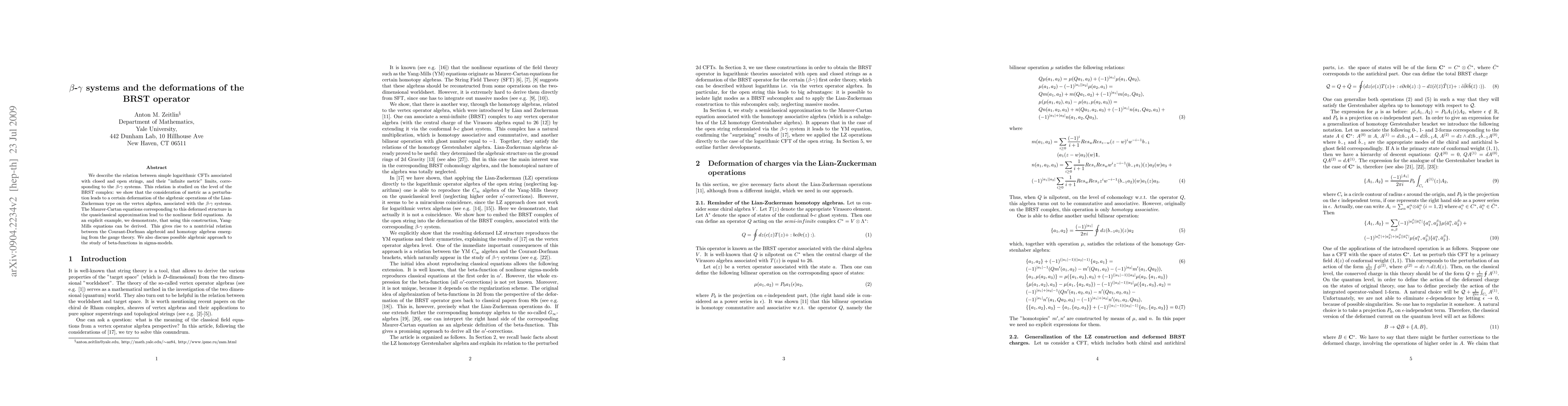 We describe the relation between simple logarithmic CFTs associated with closed and open strings, and their "infinite metric" limits, corresponding to the beta-gamma systems. This relation is studied on the level of the BRST complex: we show that the consideration of metric as a perturbation leads to a certain deformation of the algebraic operations of the Lian-Zuckerman type on the vertex algebra, associated with the beta-gamma systems. The Maurer-Cartan equations corresponding to this deformed structure in the quasiclassical approximation lead to the nonlinear field equations. As an explicit example, we demonstrate, that using this construction, Yang-Mills equations can be derived. This gives rise to a nontrivial relation between the Courant-Dorfman algebroid and homotopy algebras emerging from the gauge theory. We also discuss possible algebraic approach to the study of beta-functions in sigma-models.
