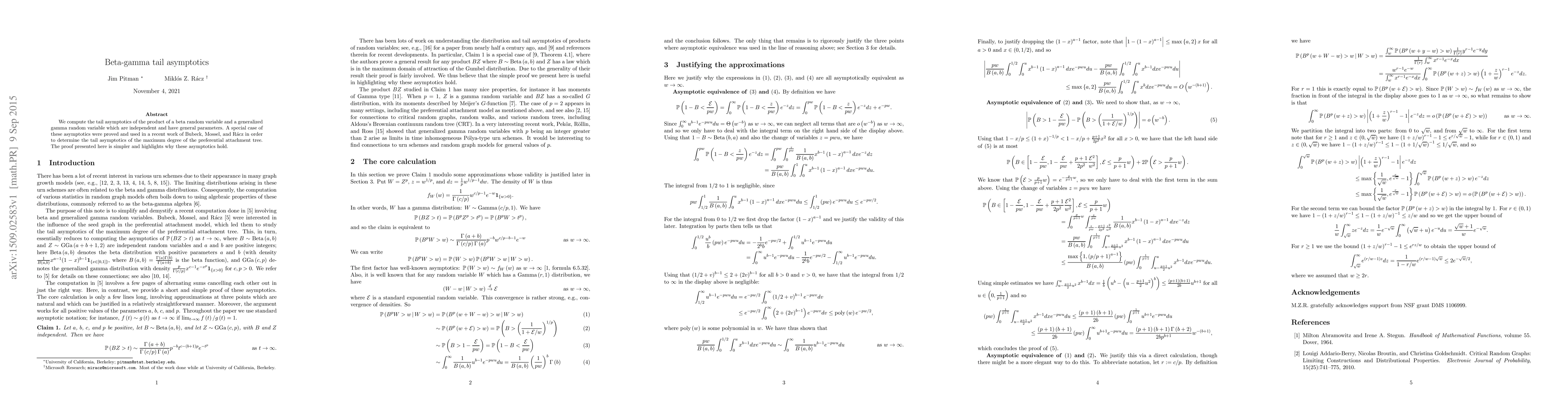 This paper computes the tail asymptotics for the product of independent beta and generalized gamma random variables, providing a simpler proof that clarifies the underlying reasons for these asymptotic behaviors, which were previously used in analyzing the maximum degree of a preferential attachment tree.
