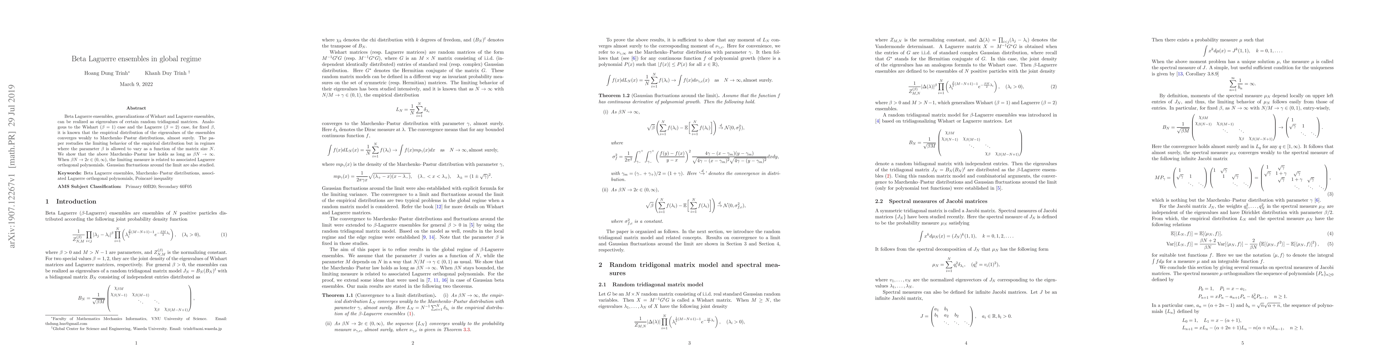 Beta Laguerre ensembles which are generalizations of Wishart ensembles and Laguerre ensembles can be realized as eigenvalues of certain random tridiagonal matrices. Analogous to the Wishart ($\beta=1$) case and the Laguerre ($\beta = 2$) case, for fixed $\beta$, it is known that the empirical distribution of the eigenvalues of these ensembles converges weakly to Marchenko--Pastur distributions, almost surely. The paper restudies the limiting behavior of the empirical distribution but in regimes where the parameter $\beta$ is allowed to vary as a function of the matrix size $N$. We show that the above Marchenko--Pastur law holds as long as $\beta N \to \infty$. When $\beta N \to 2c \in (0, \infty)$, the limit is related to associated Laguerre orthogonal polynomials. Gaussian fluctuations around the limit are also studied.