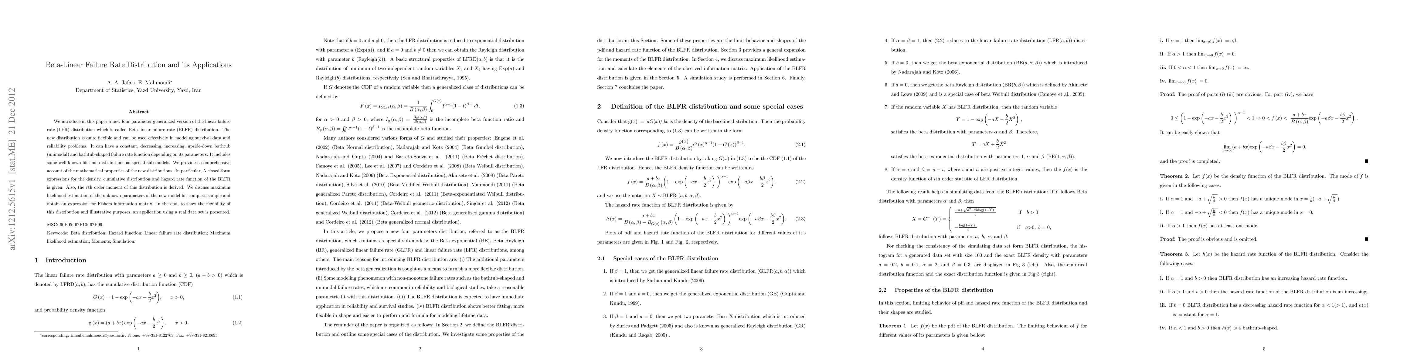 This paper introduces a new four-parameter Beta-linear failure rate (BLFR) distribution, which offers flexibility in modeling various failure rate functions and includes special submodels of known lifetime distributions. The paper provides mathematical properties, estimation techniques, and an application to real data to demonstrate its practical utility.