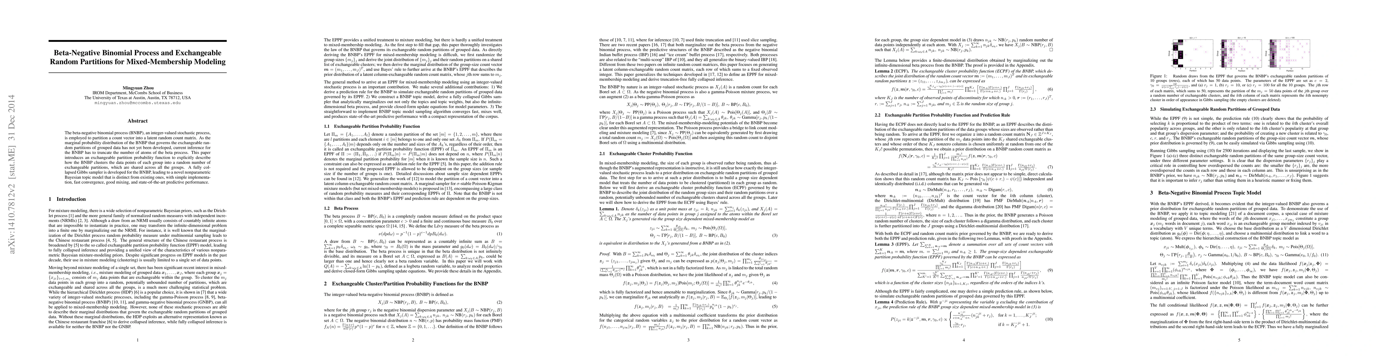 The paper introduces a beta-negative binomial process (BNBP) to model mixed-membership data through exchangeable random partitions, developing an explicit partition probability function and a collapsed Gibbs sampler, resulting in a novel, efficient nonparametric Bayesian topic model.