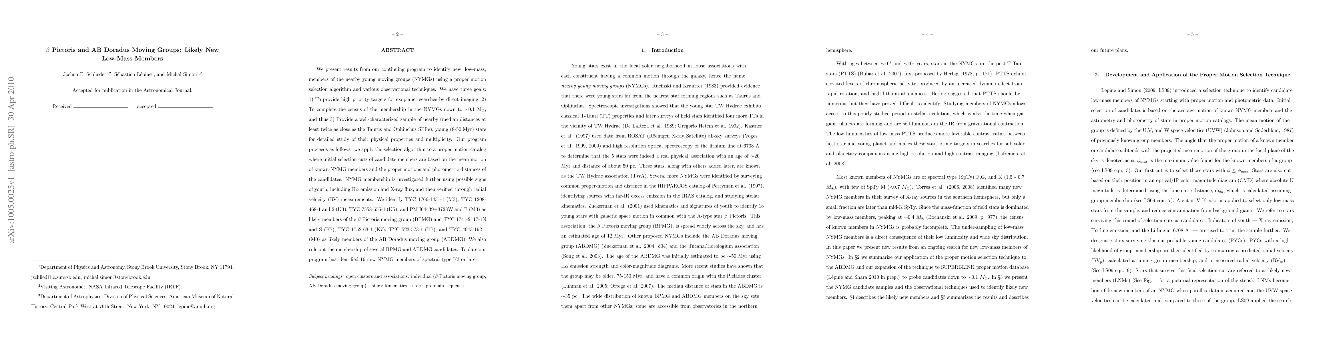 This paper identifies new low-mass members of the Beta Pictoris and AB Doradus moving groups using proper motion selection and observational techniques. It aims to provide targets for exoplanet searches, complete the census of nearby young moving groups, and offer a well-characterized sample of young stars for detailed study. The study confirms several new likely members and rules out others, contributing 16 new members identified to date.