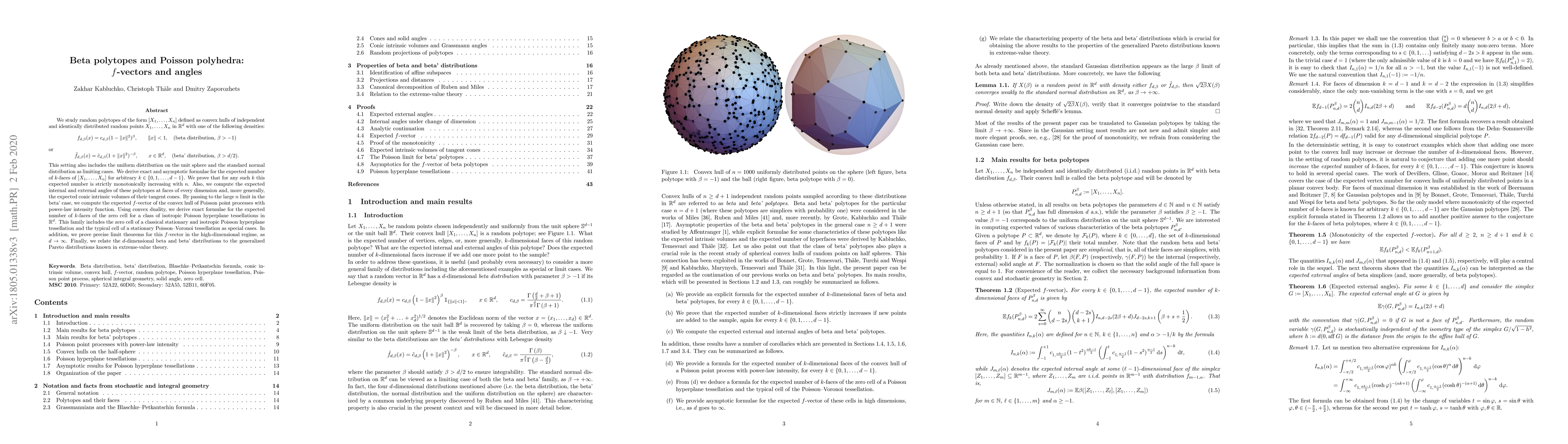 This paper studies random polytopes formed by convex hulls of random points distributed according to beta or beta' distributions, deriving exact and asymptotic formulae for their expected $k$-face counts and angles. It also examines the $f$-vectors of Poisson point processes and Poisson hyperplane tessellations, proving limit theorems for high dimensions and linking the distributions to generalized Pareto distributions in extreme-value theory.