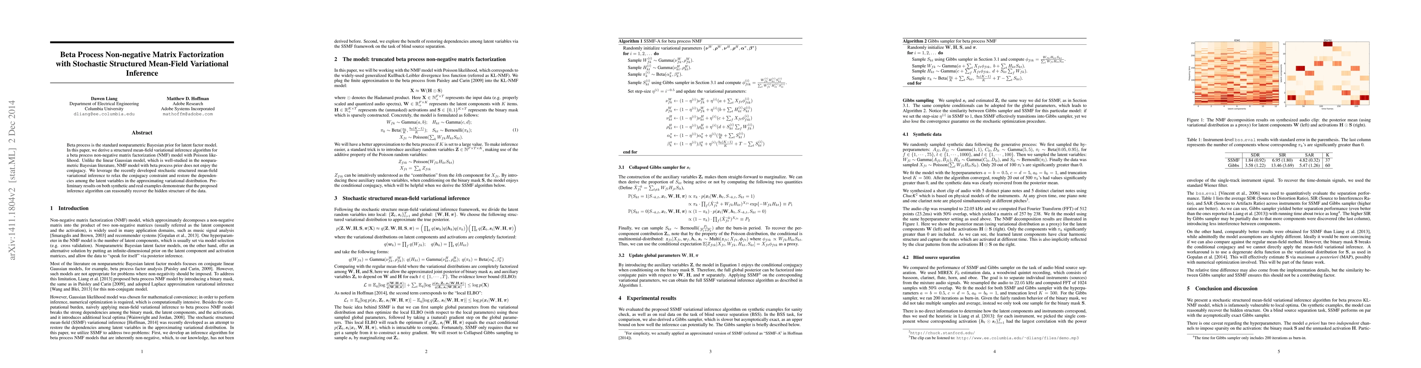 This paper proposes a structured mean-field variational inference algorithm for beta process non-negative matrix factorization with Poisson likelihood, addressing the lack of conjugacy in the model. The algorithm leverages stochastic structured mean-field variational inference to recover hidden data structures, as demonstrated by preliminary results on synthetic and real datasets.