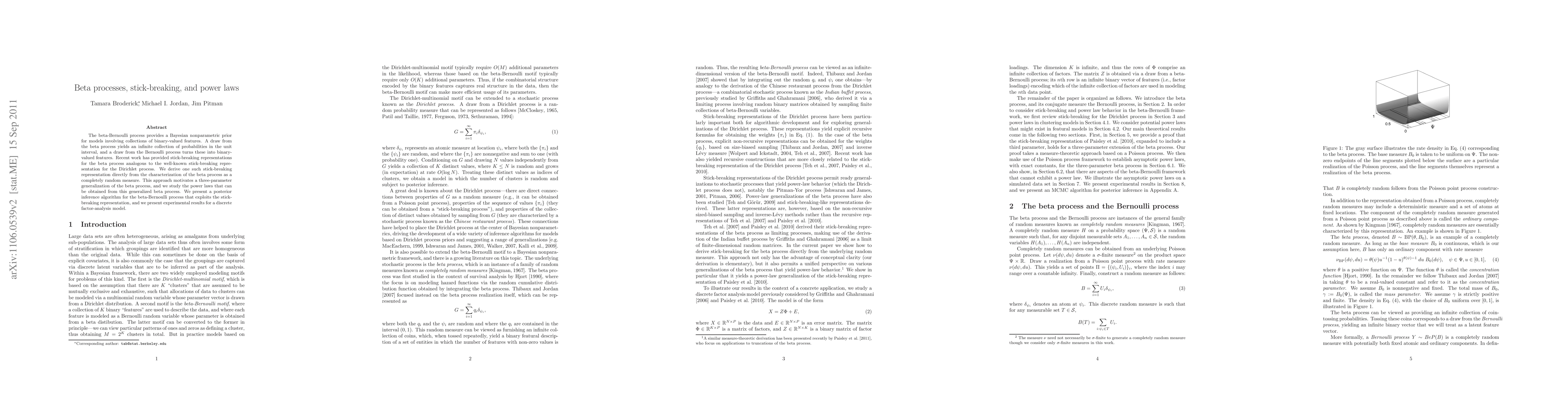 The paper establishes a direct link between the completely random measure representation of the beta process and its stick-breaking form, leading to a three-parameter generalization and an analysis of power laws.