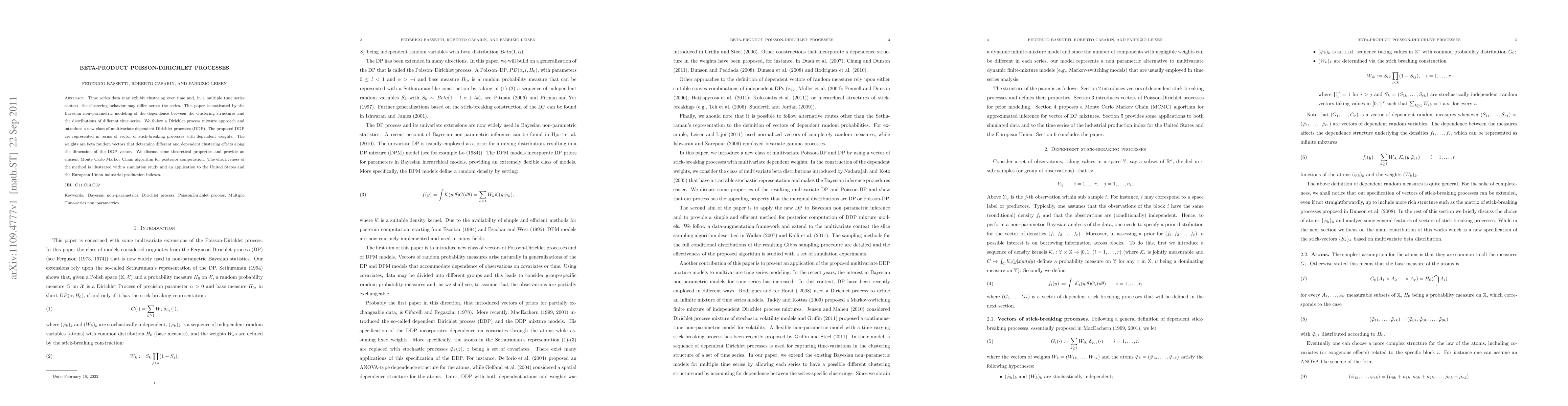 Time series data may exhibit clustering over time and, in a multiple time series context, the clustering behavior may differ across the series. This paper is motivated by the Bayesian non--parametric modeling of the dependence between the clustering structures and the distributions of different time series. We follow a Dirichlet process mixture approach and introduce a new class of multivariate dependent Dirichlet processes (DDP). The proposed DDP are represented in terms of vector of stick-breaking processes with dependent weights. The weights are beta random vectors that determine different and dependent clustering effects along the dimension of the DDP vector. We discuss some theoretical properties and provide an efficient Monte Carlo Markov Chain algorithm for posterior computation. The effectiveness of the method is illustrated with a simulation study and an application to the United States and the European Union industrial production indexes.