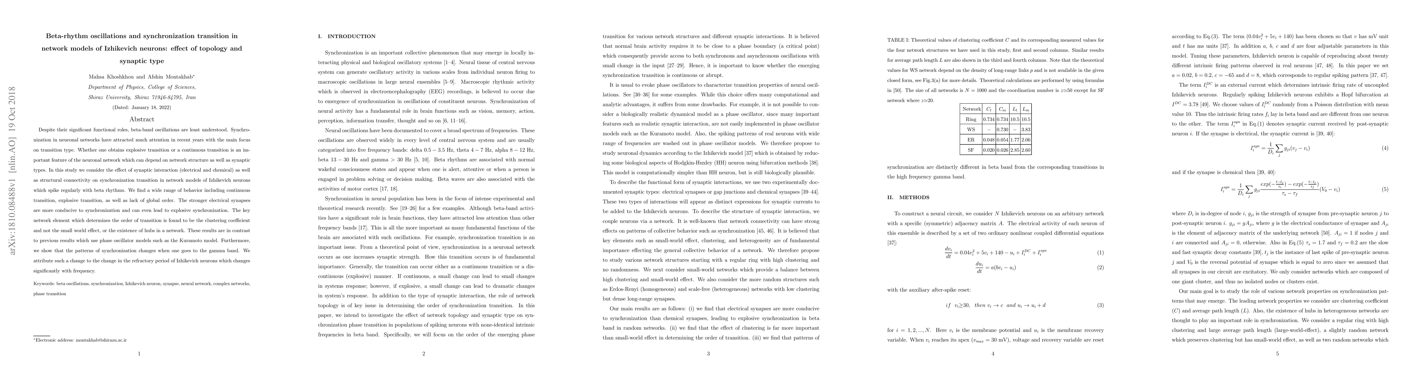 Despite their significant functional roles, beta-band oscillations are least understood. Synchronization in neuronal networks have attracted much attention in recent years with the main focus on transition type. Whether one obtains explosive transition or a continuous transition is an important feature of the neuronal network which can depend on network structure as well as synaptic types. In this study we consider the effect of synaptic interaction (electrical and chemical) as well as structural connectivity on synchronization transition in network models of Izhikevich neurons which spike regularly with beta rhythms. We find a wide range of behavior including continuous transition, explosive transition, as well as lack of global order. The stronger electrical synapses are more conducive to synchronization and can even lead to explosive synchronization. The key network element which determines the order of transition is found to be the clustering coefficient and not the small world effect, or the existence of hubs in a network. These results are in contrast to previous results which use phase oscillator models such as the Kuramoto model. Furthermore, we show that the patterns of synchronization changes when one goes to the gamma band. We attribute such a change to the change in the refractory period of Izhikevich neurons which changes significantly with frequency.