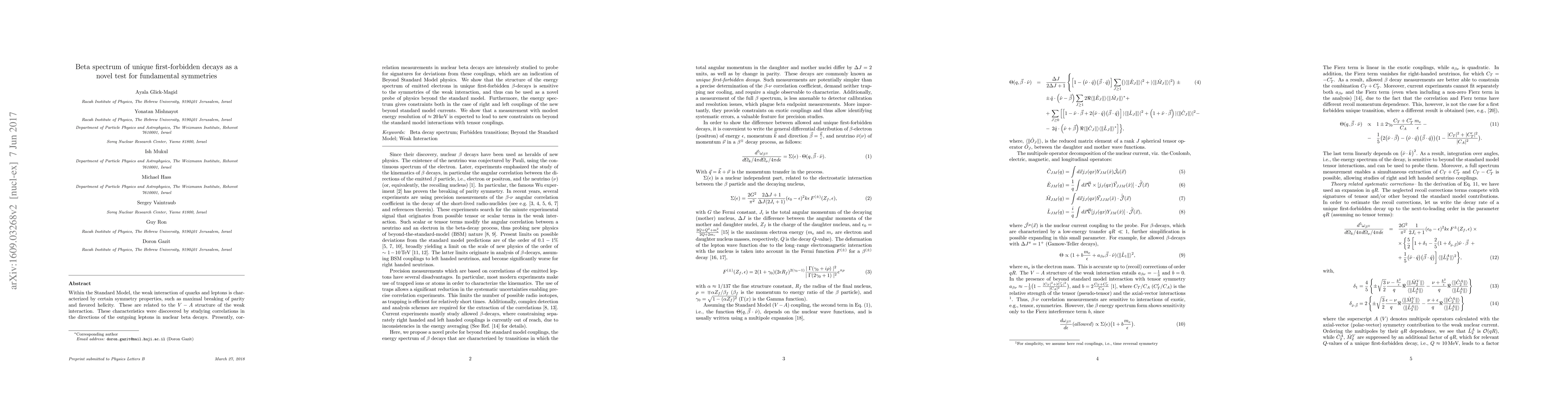 Within the Standard Model, the weak interaction of quarks and leptons is characterized by certain symmetry properties, such as maximal breaking of parity and favored helicity. These are related to the $V-A$ structure of the weak interaction. These characteristics were discovered by studying correlations in the directions of the outgoing leptons in nuclear beta decays. These days, correlation measurements in nuclear beta decays are intensively studied to probe for signatures for deviations from these symmetries, which are an indication of Beyond Standard Model physics. We show that the structure of the energy spectrum of emitted electrons in unique first-forbidden $\beta$-decays is sensitive to the symmetries of the weak interaction, and thus can be used as a novel probe of physics beyond the standard model. Furthermore, the energy spectrum gives constraints both in the case of right and left coupling of the new symmetry currents. We show that a measurement with modest energy resolution of about 20 keV is expected to lead to new constraints on beyond the standard model interactions with tensor symmetry.