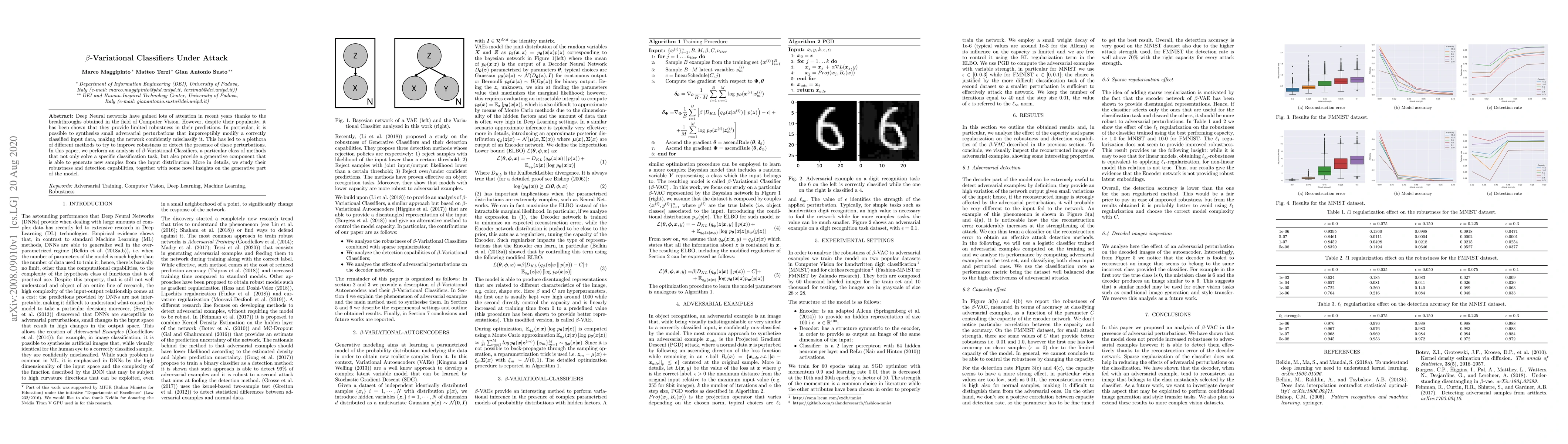 Deep Neural networks have gained lots of attention in recent years thanks to the breakthroughs obtained in the field of Computer Vision. However, despite their popularity, it has been shown that they provide limited robustness in their predictions. In particular, it is possible to synthesise small adversarial perturbations that imperceptibly modify a correctly classified input data, making the network confidently misclassify it. This has led to a plethora of different methods to try to improve robustness or detect the presence of these perturbations. In this paper, we perform an analysis of $\beta$-Variational Classifiers, a particular class of methods that not only solve a specific classification task, but also provide a generative component that is able to generate new samples from the input distribution. More in details, we study their robustness and detection capabilities, together with some novel insights on the generative part of the model.