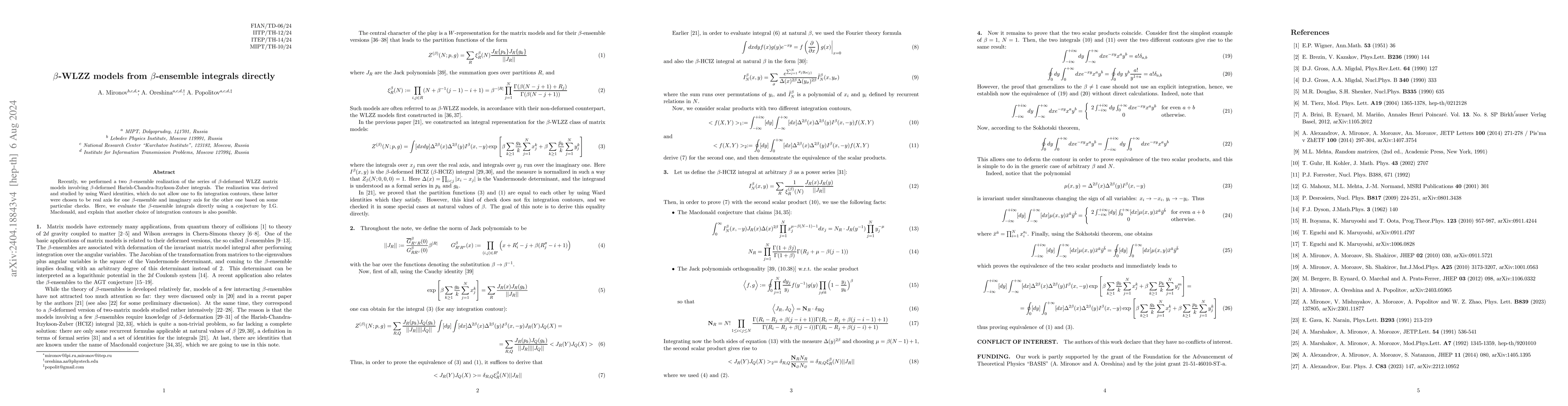 This paper evaluates $\beta$-deformed WLZZ matrix models by directly computing $\beta$-ensemble integrals, derived via Ward identities. The authors confirm a conjecture by I.G. Macdonald and explore alternative integration contours, initially chosen based on specific checks.