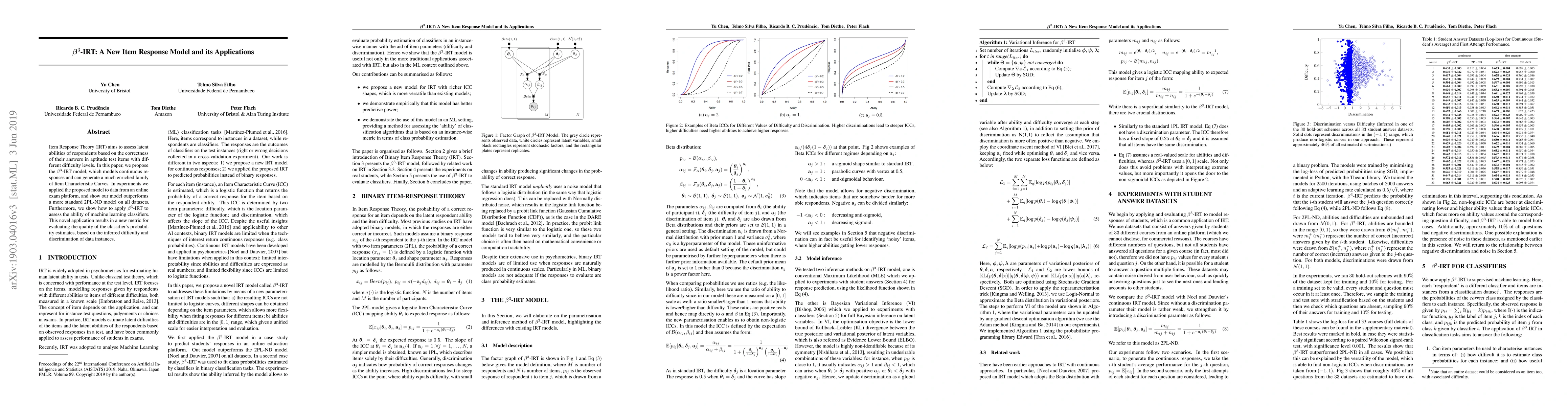 The $\beta^3$-IRT model is introduced to model continuous responses and generate a richer family of Item Characteristic Curves, outperforming the standard 2PL-ND model in online exam data. It also extends to evaluate machine learning classifiers by assessing the quality of their probability estimates.