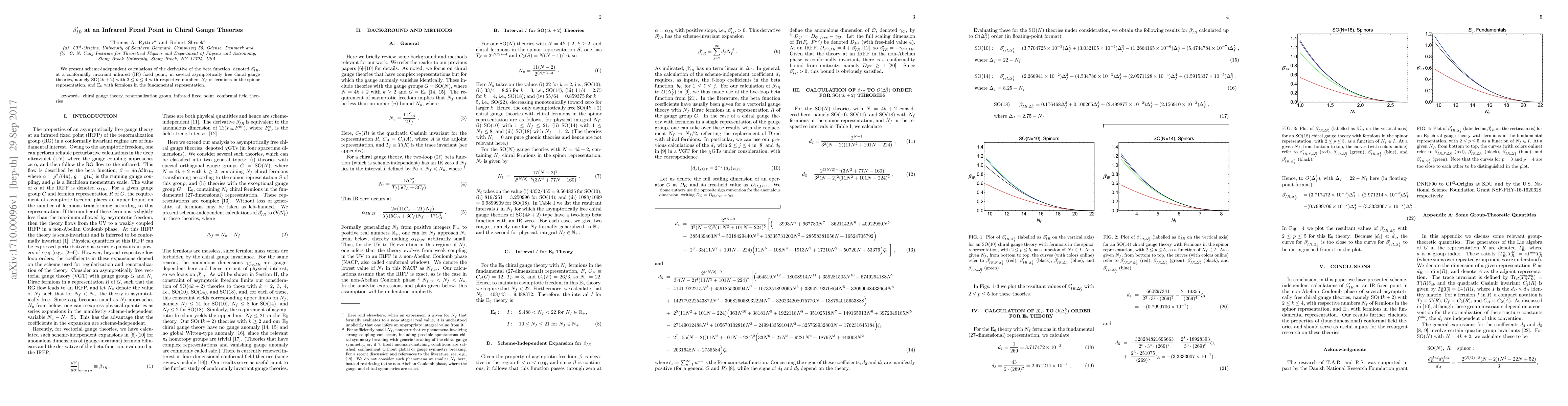 This paper provides scheme-independent calculations of $\beta'_{IR}$ at an infrared fixed point in several asymptotically free chiral gauge theories, including SO($4k+2$) for $2 \le k \le 4$ and E$_6$, focusing on their respective fermion representations.