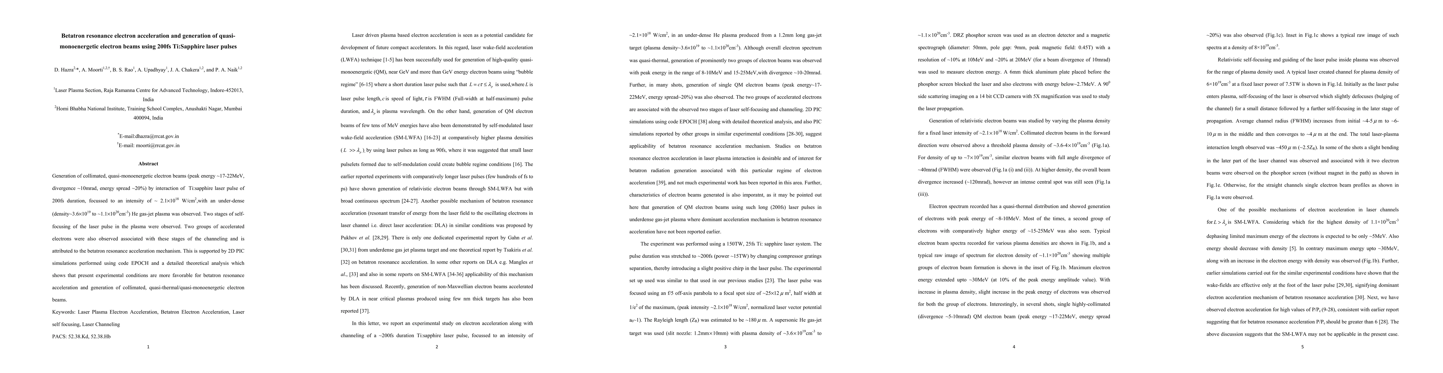 Generation of collimated, quasi-monoenergetic electron beams (peak energy ~17-22MeV, divergence ~10mrad, energy spread ~20%) by interaction of Ti:sapphire laser pulse of 200fs duration, focussed to an intensity of ~ 2.1x10^18 W/cm^2,with an under-dense (density~3.6x10^19 to ~1.1x10^20 cm-3) He gas-jet plasma was observed. Two stages of self-focusing of the laser pulse in the plasma were observed. Two groups of accelerated electrons were also observed associated with these stages of the channeling and is attributed to the betatron resonance acceleration mechanism. This is supported by 2D PIC simulations performed using code EPOCH and a detailed theoretical analysis which shows that present experimental conditions are more favorable for betatron resonance acceleration and generation of collimated, quasi-thermal/quasi-monoenergetic electron beams.