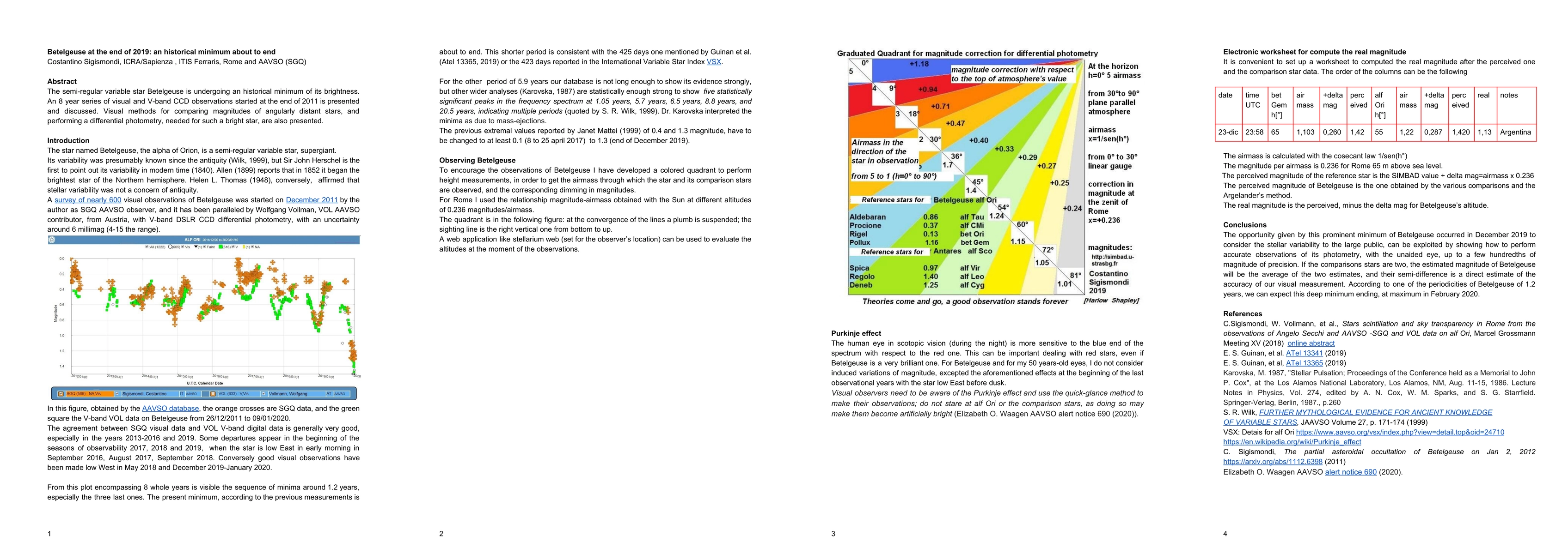 The semi-regular variable star Betelgeuse is undergoing an historical minimum of its brightness. An 8 year series of visual and V-band CCD observations started at the end of 2011 is presented and discussed. Visual methods for comparing magnitudes of angularly distant stars, and performing a differential photometry, needed for such a bright star, are also presented.