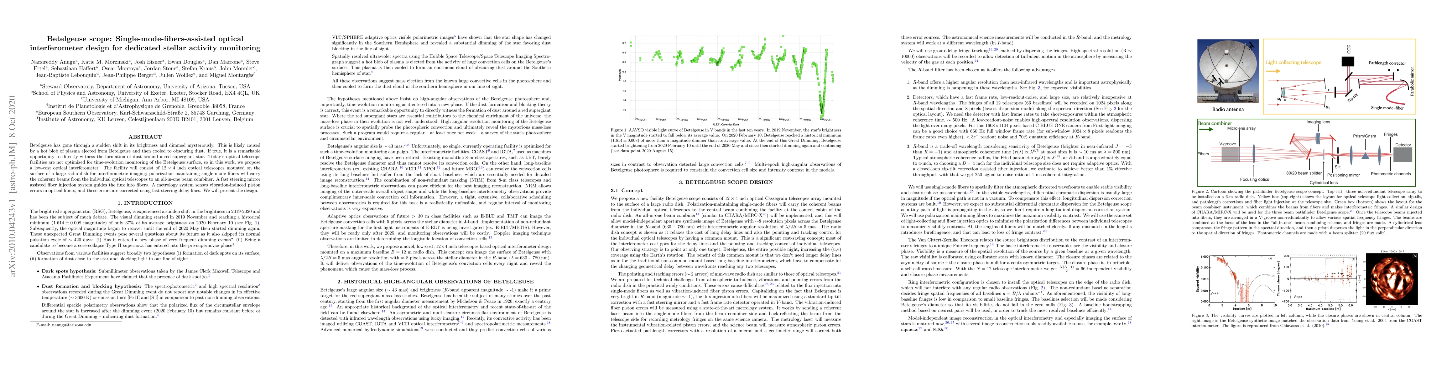 Betelgeuse has gone through a sudden shift in its brightness and dimmed mysteriously. This is likely caused by a hot blob of plasma ejected from Betelgeuse and then cooled to obscuring dust. If true, it is a remarkable opportunity to directly witness the formation of dust around a red supergiant star. Today's optical telescope facilities are not optimized for time-evolution monitoring of the Betelgeuse surface, so in this work, we propose a low-cost optical interferometer. The facility will consist of $12 \times 4$ inch optical telescopes mounted on the surface of a large radio dish for interferometric imaging; polarization-maintaining single-mode fibers will carry the coherent beams from the individual optical telescopes to an all-in-one beam combiner. A fast steering mirror assisted fiber injection system guides the flux into fibers. A metrology system senses vibration-induced piston errors in optical fibers, and these errors are corrected using fast-steering delay lines. We will present the design.