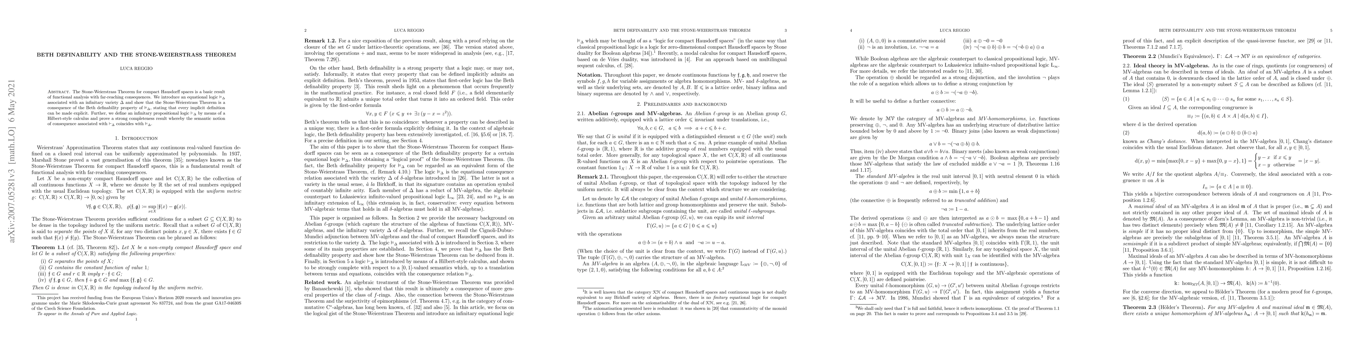 The paper connects the Stone-Weierstrass Theorem to Beth definability within an infinitary variety, demonstrating that the theorem follows from the property that every implicit definition can be made explicit. It also establishes a strong completeness result for an associated infinitary propositional logic.