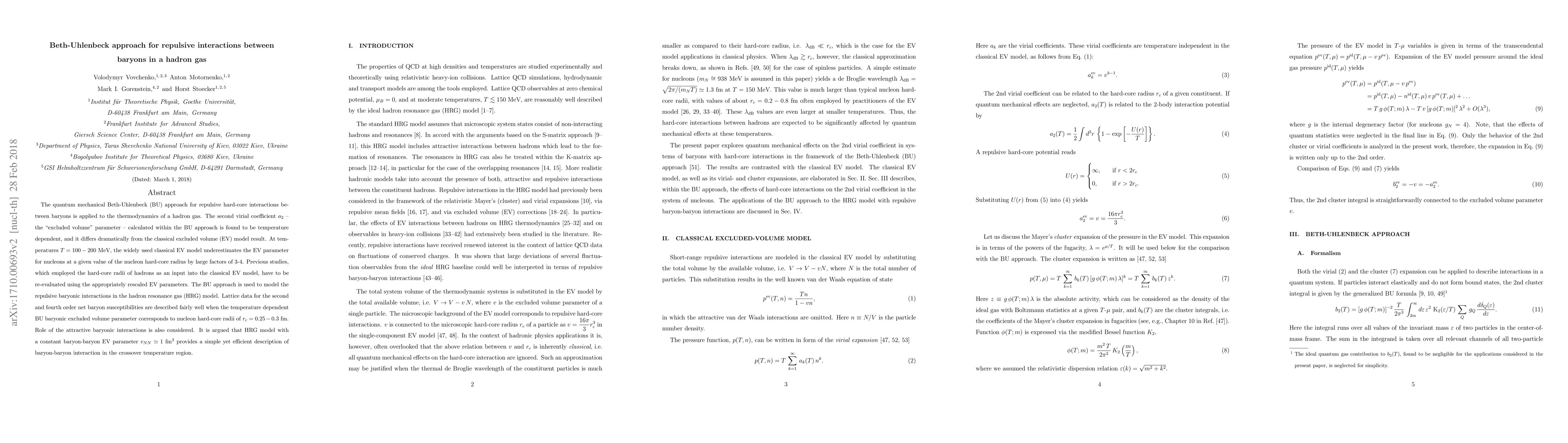 The quantum mechanical Beth-Uhlenbeck (BU) approach for repulsive hard-core interactions between baryons is applied to the thermodynamics of a hadron gas. The second virial coefficient $a_2$ -- the "excluded volume" parameter -- calculated within the BU approach is found to be temperature dependent, and it differs dramatically from the classical excluded volume (EV) model result. At temperatures $T =100-200$ MeV, the widely used classical EV model underestimates the EV parameter for nucleons at a given value of the nucleon hard-core radius by large factors of 3-4. Previous studies, which employed the hard-core radii of hadrons as an input into the classical EV model, have to be re-evaluated using the appropriately rescaled EV parameters. The BU approach is used to model the repulsive baryonic interactions in the hadron resonance gas (HRG) model. Lattice data for the second and fourth order net baryon susceptibilities are described fairly well when the temperature dependent BU baryonic excluded volume parameter corresponds to nucleon hard-core radii of $r_c = 0.25-0.3$ fm. Role of the attractive baryonic interactions is also considered. It is argued that HRG model with a constant baryon-baryon EV parameter $v_{NN} \simeq 1$ fm$^3$ provides a simple yet efficient description of baryon-baryon interaction in the crossover temperature region.