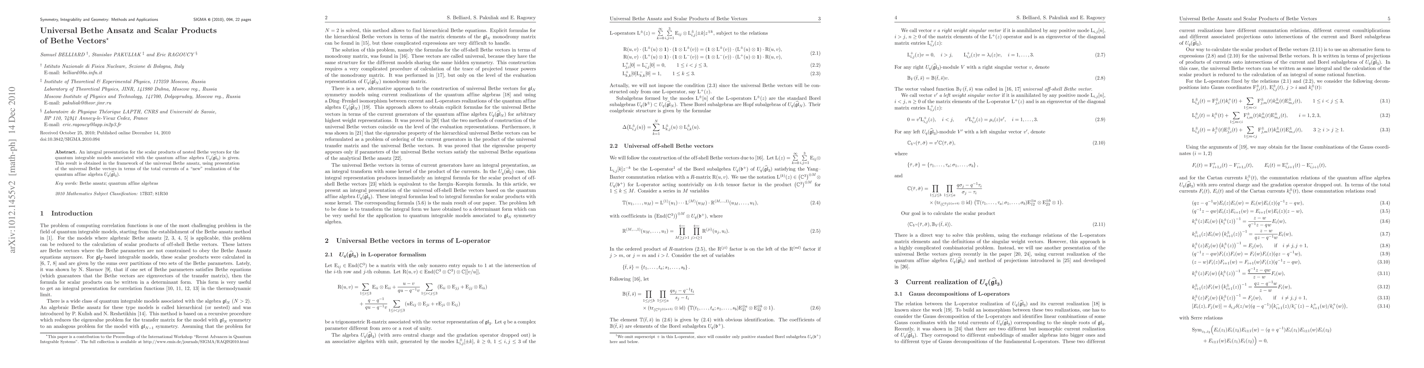 An integral presentation for the scalar products of nested Bethe vectors for the quantum integrable models associated with the quantum affine algebra $U_q(\hat{\mathfrak{gl}}_3)$ is given. This result is obtained in the framework of the universal Bethe ansatz, using presentation of the universal Bethe vectors in terms of the total currents of a "new" realization of the quantum affine algebra $U_q(\hat{\mathfrak{gl}}_3)$.