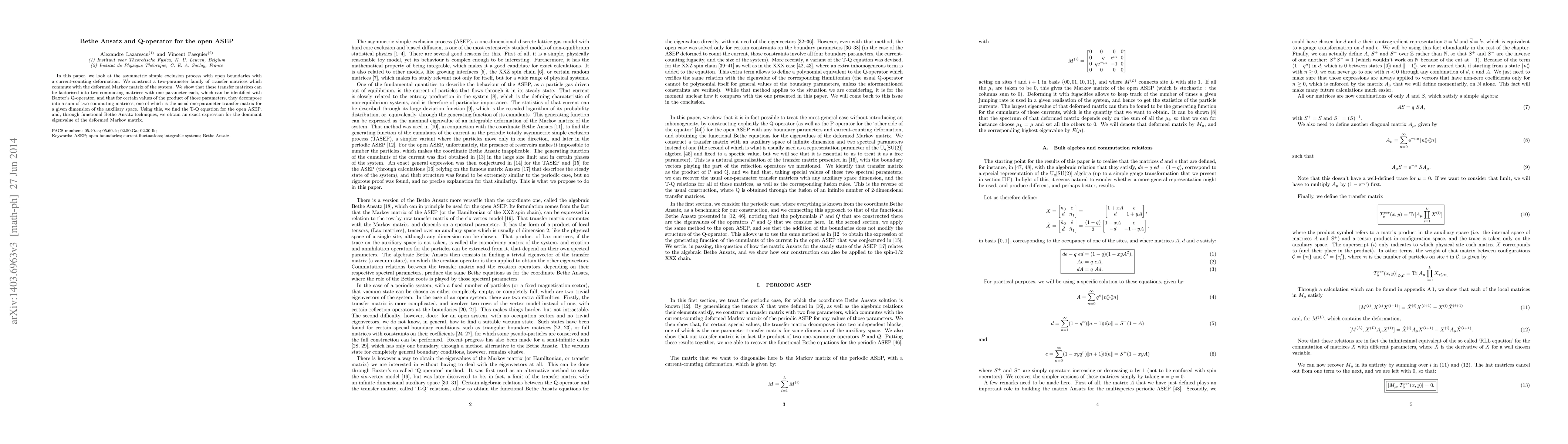 This paper constructs a two-parameter family of commuting transfer matrices for the open ASEP with a current-counting deformation, identifying them with Baxter's Q-operator. It derives the T-Q equation and uses functional Bethe Ansatz techniques to find an exact expression for the dominant eigenvalue of the deformed Markov matrix.