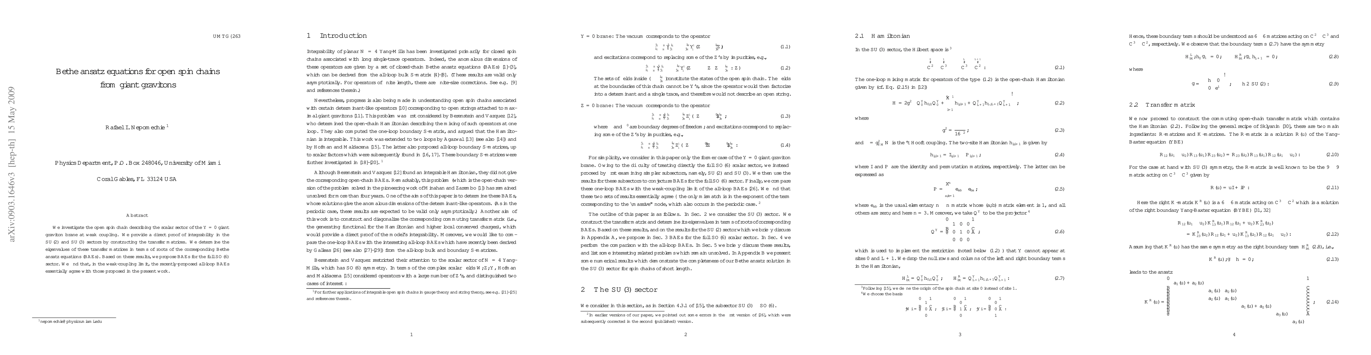 This paper investigates integrability in open spin chains describing giant gravitons at weak coupling, proposing Bethe ansatz equations for the scalar sector of the Y=0 giant graviton brane.