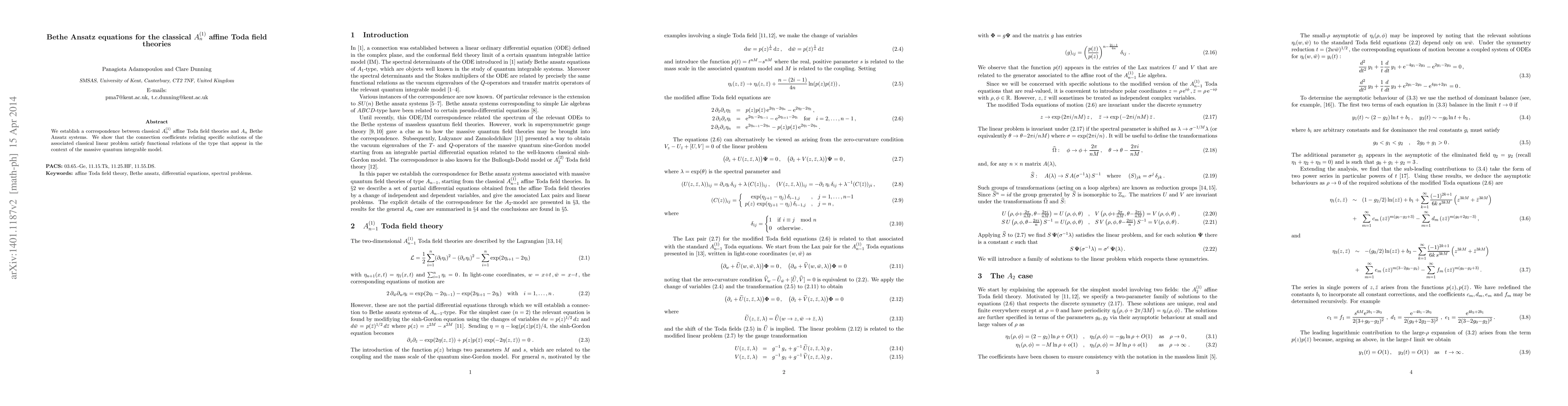 Summary: This paper establishes a correspondence between classical $A_n^{(1)}$ affine Toda field theories and $A_n$ Bethe Ansatz systems, revealing that the connection coefficients between classical solutions adhere to functional relations akin to those found in massive quantum integrable models.