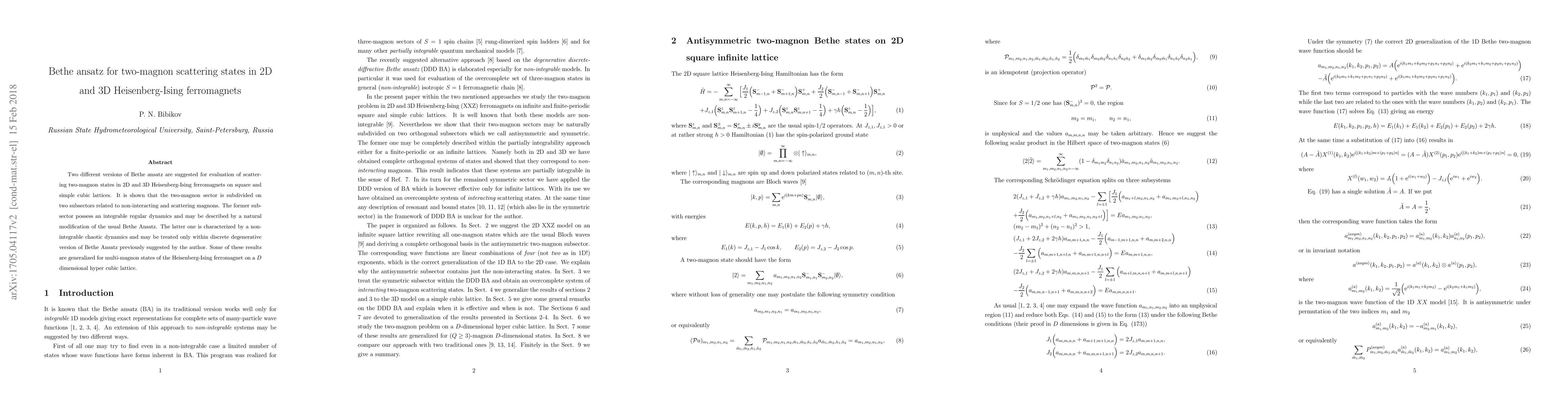 This paper proposes various Bethe ansatz methods for evaluating two-magnon scattering states in 2D and 3D Heisenberg-Ising ferromagnets, showing that a significant portion of states conform to generalized Bethe forms, while others are addressed using a discrete-diffractive modification.