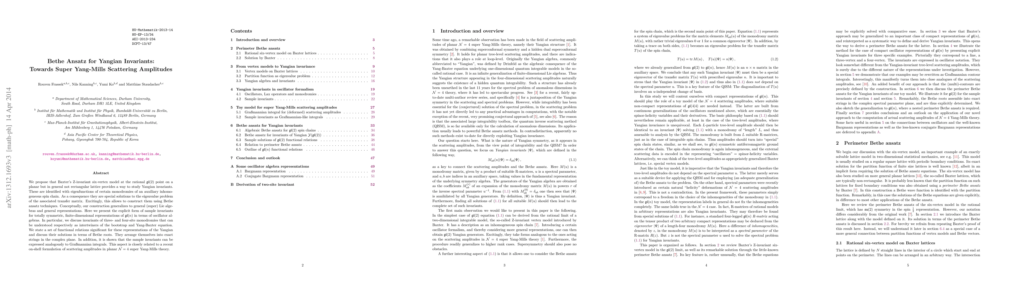 This paper proposes using Baxter's Z-invariant six-vertex model to study Yangian invariants, constructing them via Bethe ansatz techniques. It presents explicit forms of these invariants for gl(n) representations and discusses their functional relations, linking them to scattering amplitudes in N=4 super Yang-Mills theory.