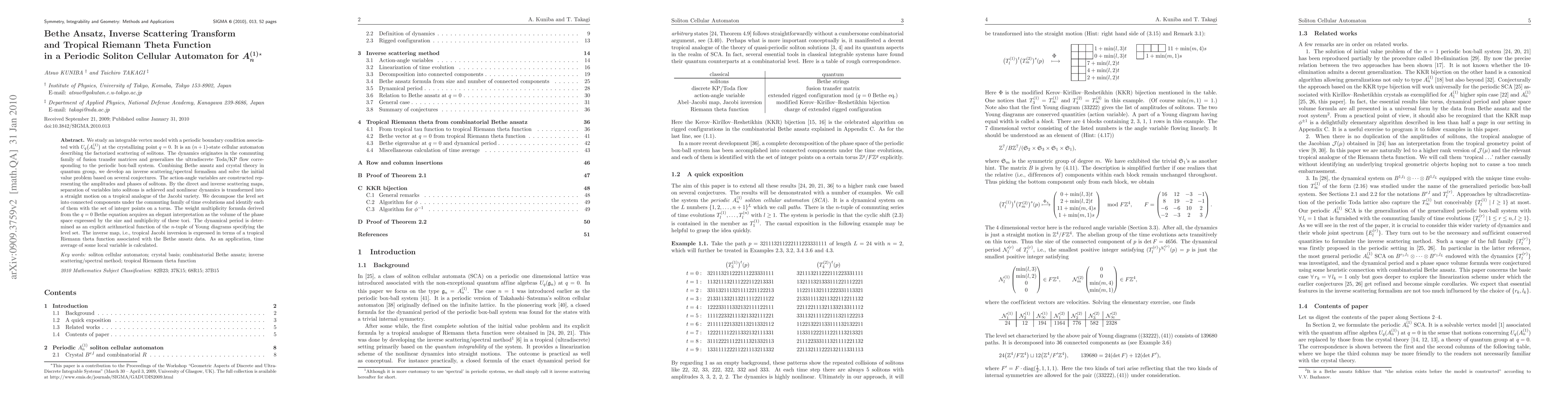 This paper explores an integrable vertex model in a periodic soliton cellular automaton linked to U_q(A_n^{(1)}) at q=0, employing Bethe ansatz and inverse scattering methods to solve the initial value problem. It reveals a tropical analogue of the Jacobi variety and uses a tropical Riemann theta function to express the inverse map, providing insights into the dynamics and periodicity of the system.