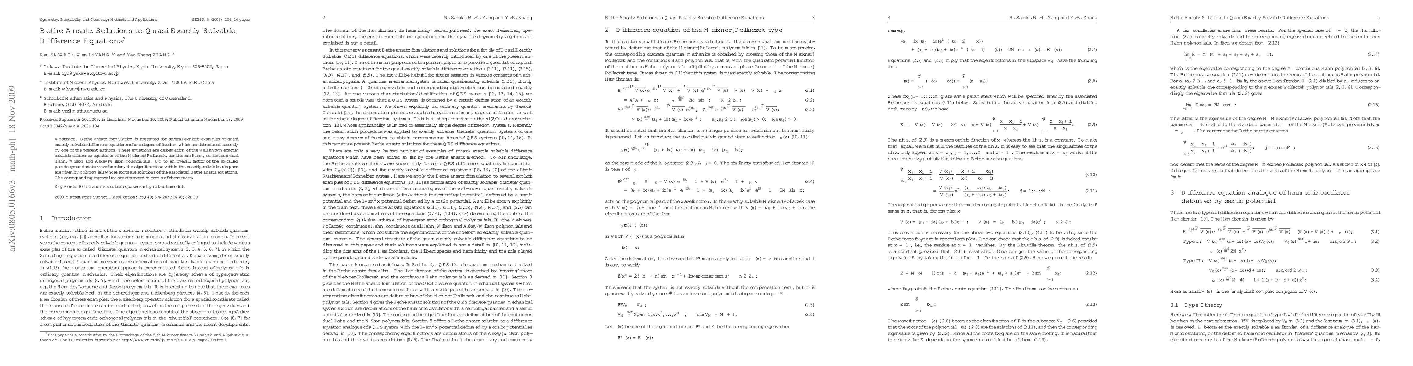The paper proposes Bethe ansatz solutions for quasi exactly solvable difference equations of one degree of freedom, derived from deformations of well-known exactly solvable equations like Meixner-Pollaczek and Askey-Wilson polynomials. Eigenfunctions are polynomial roots of the Bethe ansatz equations, with eigenvalues expressed in terms of these roots.