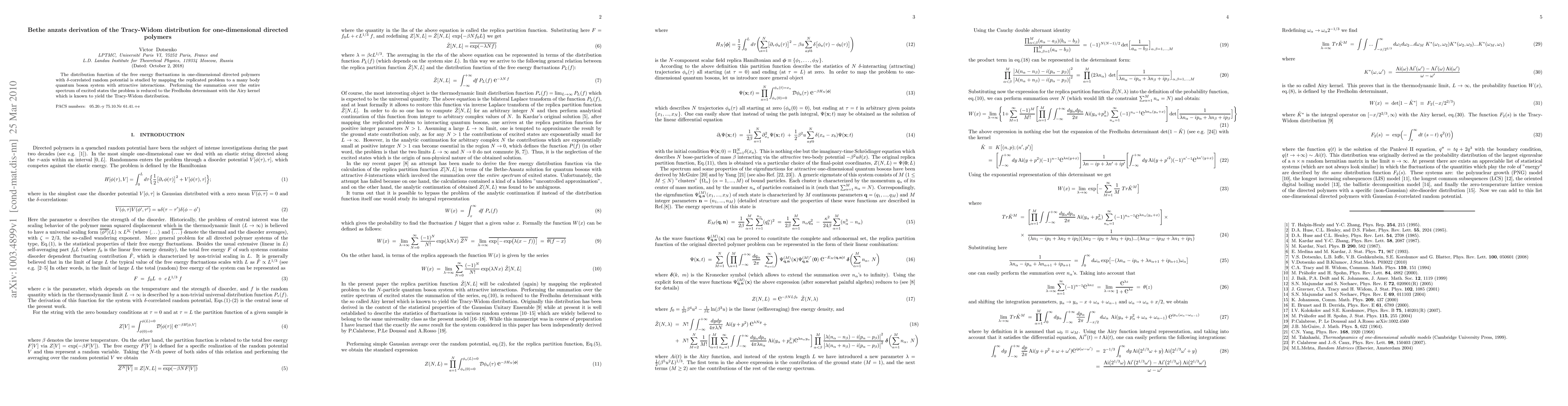 The paper derives the Tracy-Widom distribution for one-dimensional directed polymers using the Bethe ansatz, mapping the replicated problem to a quantum boson system, and reducing it to a Fredholm determinant with the Airy kernel. This approach reveals the statistical behavior of free energy fluctuations in such systems.