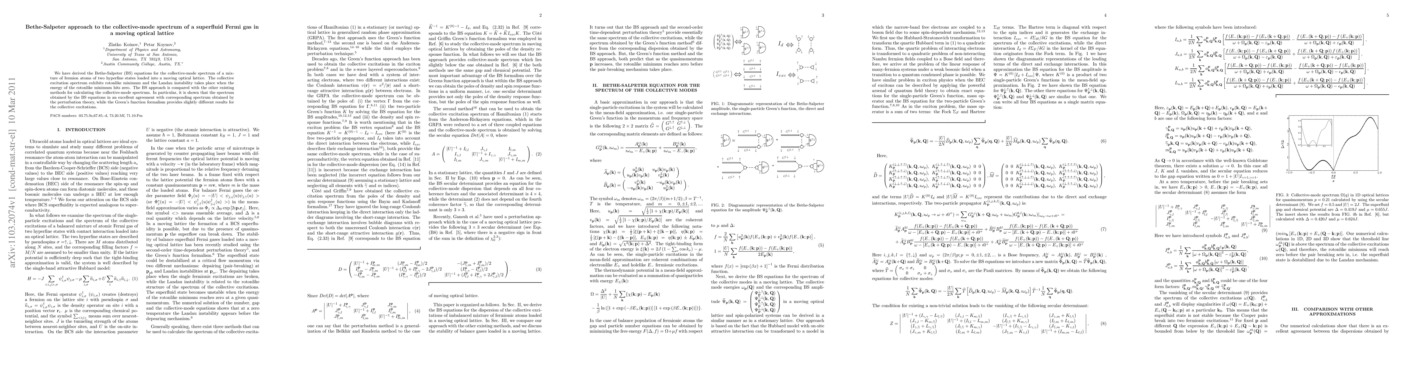 We have derived the Bethe-Salpeter (BS) equations for the collective-mode spectrum of a mixture of fermion atoms of two hyperfine states loaded into a moving optical lattice. The collective excitation spectrum exhibits rotonlike minimum and the Landau instability takes place when the energy of the rotonlike minimum hits zero. The BS approach is compared with the other existing methods for calculating the collective-mode spectrum. In particular, it is shown that the spectrum obtained by the BS equations in an excellent agreement with corresponding spectrum obtained by the perturbation theory, while the Green's function formalism provides slightly different results for the collective excitations.