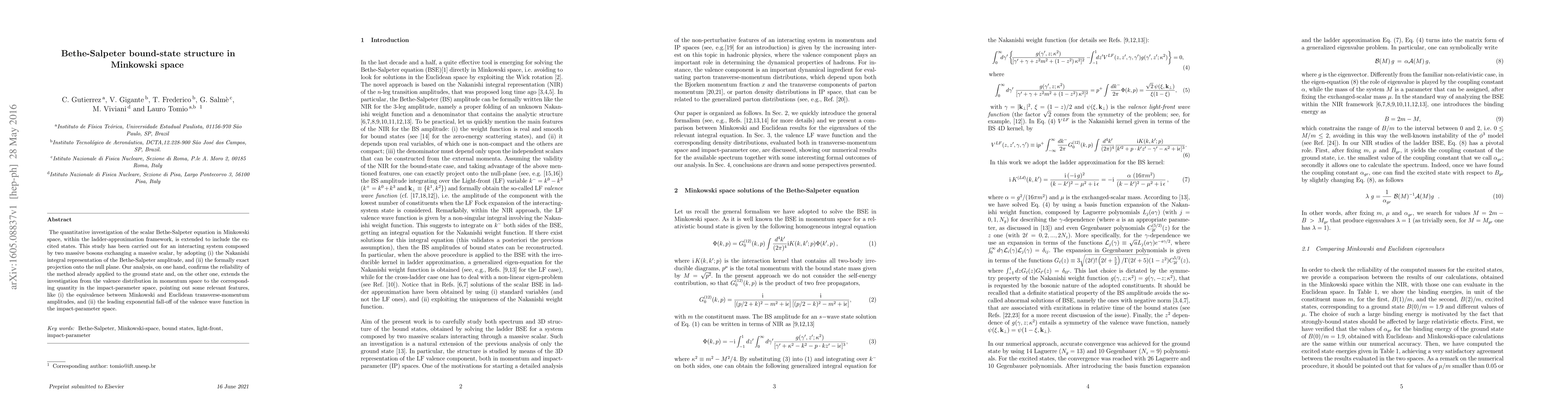 This paper investigates the scalar Bethe-Salpeter equation in Minkowski space for excited states of a system of two massive bosons, confirming the method's reliability and extending analysis to impact-parameter space, revealing equivalence between Minkowski and Euclidean transverse-momentum amplitudes and a leading exponential fall-off of the valence wave function.