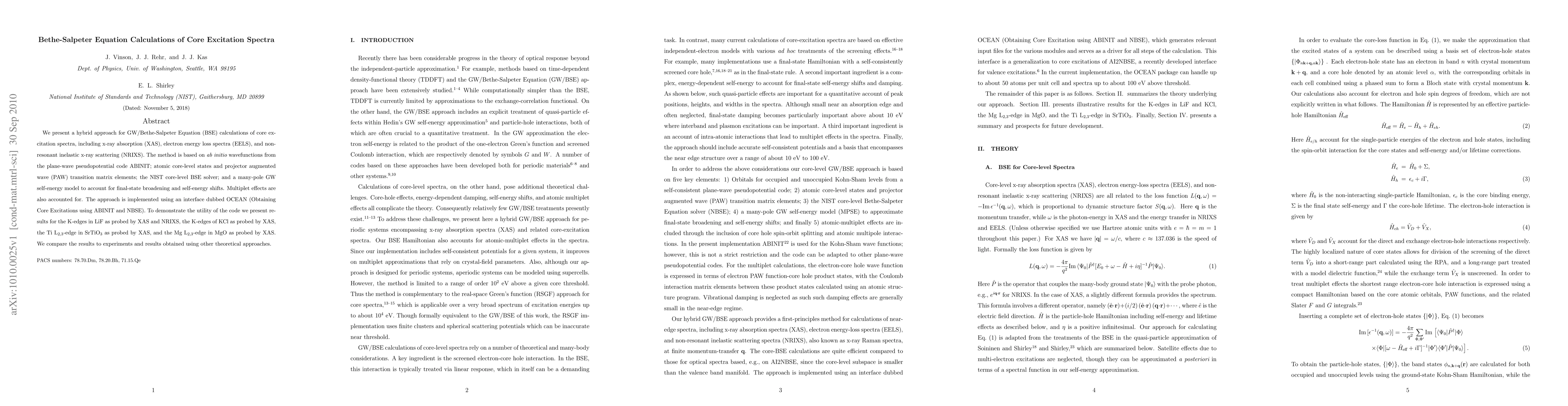 This paper introduces a novel hybrid GW/Bethe-Salpeter Equation (BSE) method for calculating core excitation spectra, including XAS, EELS, and NRIXS, using {\it ab initio} wavefunctions from ABINIT and the OCEAN interface. The method demonstrates good agreement with experimental data for various K-edge and L-edge transitions in different materials.