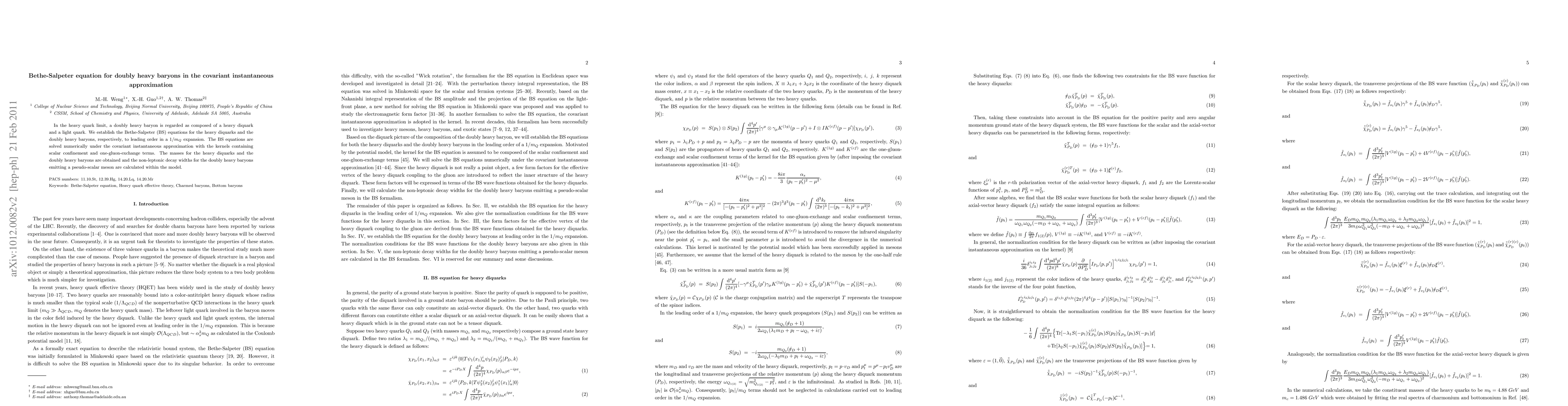 This paper establishes Bethe-Salpeter equations for doubly heavy baryons in the heavy quark limit, solving them numerically to determine masses and decay widths. The covariant instantaneous approximation incorporates scalar confinement and one-gluon-exchange interactions.