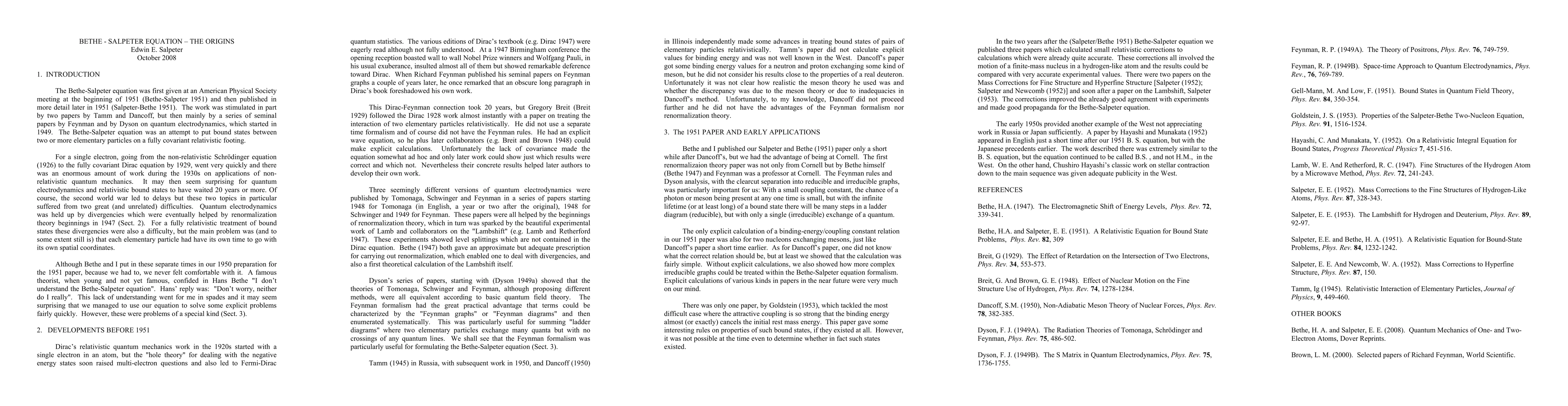 Summary: This article traces the historical origins and foundational background of the Bethe-Salpeter equation, a key equation in quantum many-body theory used to describe the dynamics of electron-hole pairs in quantum physics. It provides insight into its development and significance in theoretical physics.