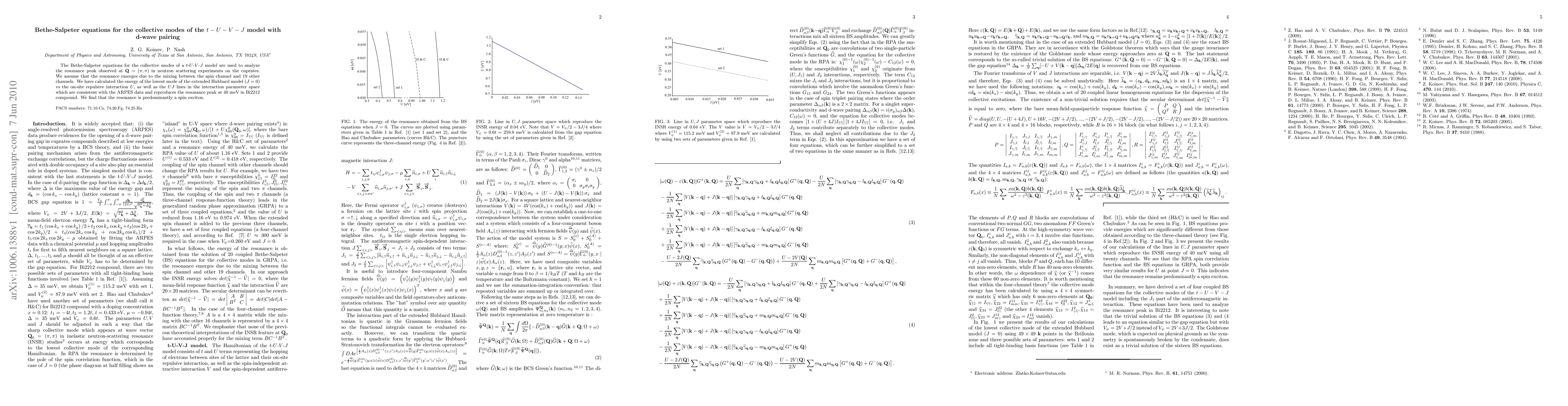 The Bethe-Salpeter equations for the collective modes of a $t$-$U$-$V$-$J$ model are used to analyze the resonance peak observed at $\bf{Q}=(\pi,\pi)$ in neutron scattering experiments on the cuprates. We assume that the resonance emerges due to the mixing between the spin channel and 19 other channels. We have calculated the energy of the lowest mode of the extended Hubbard model ($J=0$) vs the on-site repulsive interaction $U$, as well as the $UJ$ lines in the interaction parameter space which are consistent with the ARPES data and reproduces the resonance peak at 40 meV in Bi2212 compound. We find that the resonance is predominantly a spin exciton.