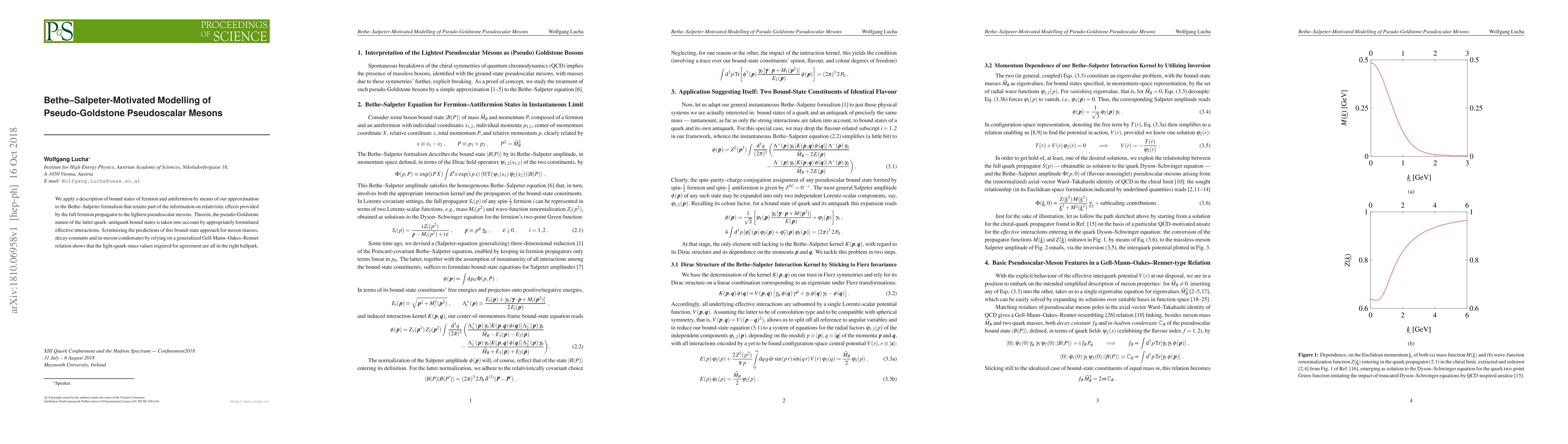 We apply a description of bound states of fermion and antifermion by means of our approximation to the Bethe-Salpeter formalism that retains part of the information on relativistic effects provided by the full fermion propagator to the lightest pseudoscalar mesons. Therein, the pseudo-Goldstone nature of the latter quark-antiquark bound states is taken into account by appropriately formulated effective interactions. Scrutinizing the predictions of this bound-state approach for meson masses, decay constants and in-meson condensates by relying on a generalized Gell-Mann-Oakes-Renner relation shows that the light-quark-mass values required for agreement are all in the right ballpark.