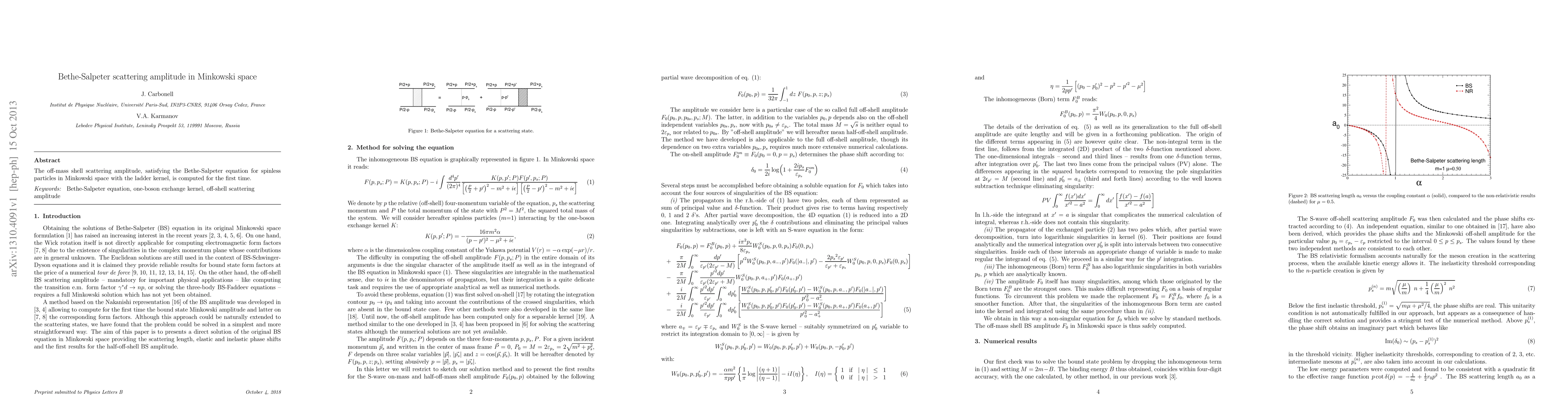 This paper computes the off-mass shell Bethe-Salpeter scattering amplitude for spinless particles in Minkowski space for the first time, using the ladder kernel to satisfy the Bethe-Salpeter equation. This provides a novel approach to understanding scattering processes in relativistic quantum mechanics.
