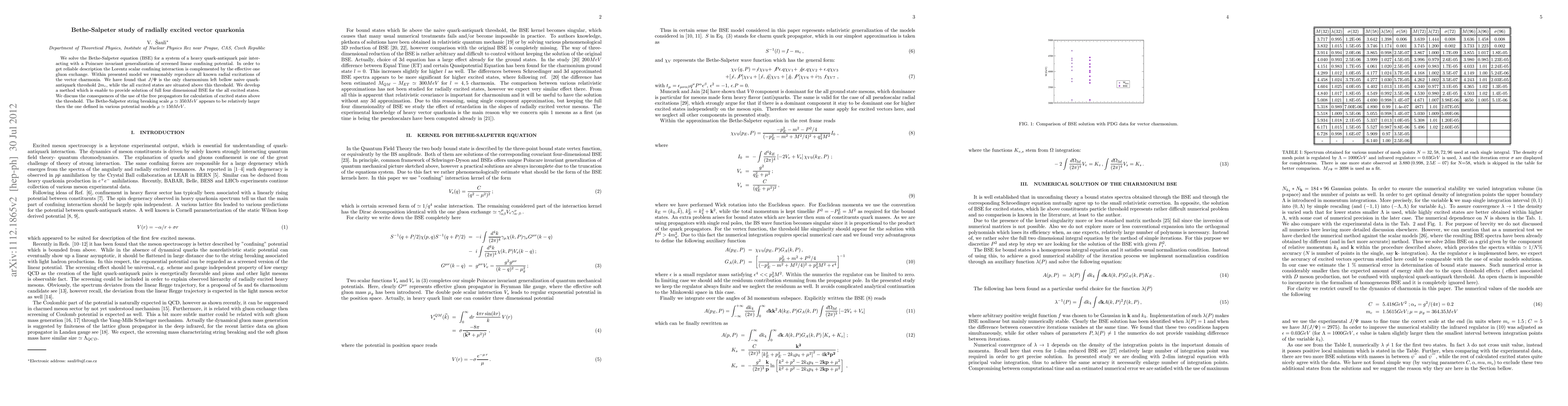 We solve the Bethe-Salpeter equation (BSE) for a system of a heavy quark-antiquark pair interacting with a Poincare invariant generalization of screened linear confining potential. In order to get reliable description the Lorentz scalar confining interaction is complemented by the effective one gluon exchange. Within presented model we reasonably reproduce all known radial excitations of the vector charmonia. We have found that $J/\Psi$ is the only charmonium left bellow naive quark-antiquark threshold $2m_c$, while the all excited states are situated above this threshold. We develop a method which is enable to provide solution of full four dimensional BSE for the all excited states. We discuss the consequences of the use of the free propagators for calculation of excited states above the threshold. The Bethe-Salpeter string breaking scale $\mu\simeq 350MeV$ appears to be relatively larger then the one defined in various potential models $\mu\simeq 150MeV$.