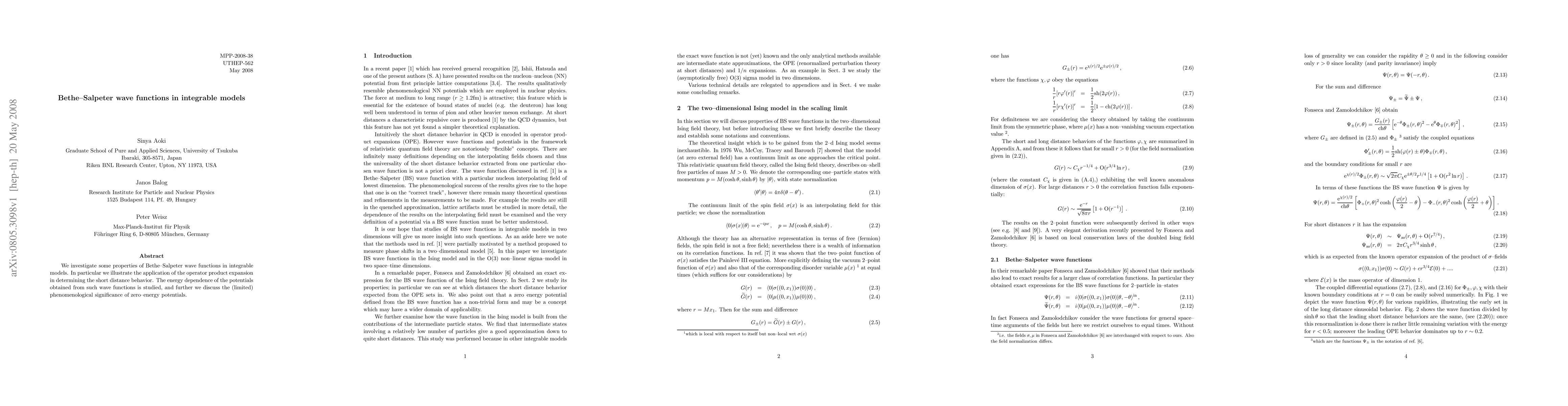 We investigate some properties of Bethe--Salpeter wave functions in integrable models. In particular we illustrate the application of the operator product expansion in determining the short distance behavior. The energy dependence of the potentials obtained from such wave functions is studied, and further we discuss the (limited) phenomenological significance of zero--energy potentials.