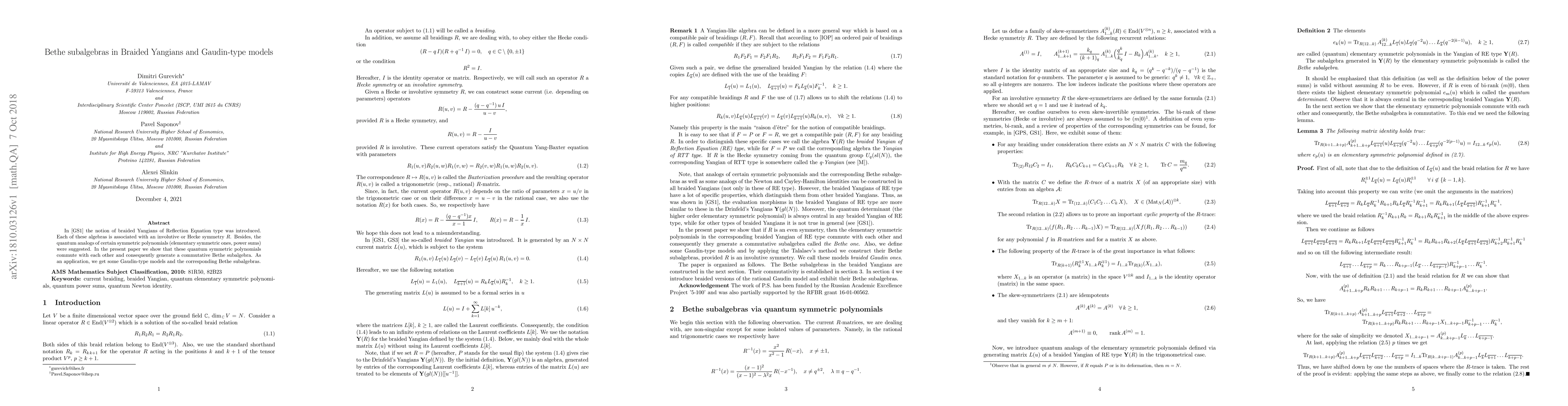 In \cite{GS1} the notion of braided Yangians of Reflection Equation type was introduced. Each of these algebras is associated with an involutive or Hecke symmetry $R$. Besides, the quantum analogs of certain symmetric polynomials (elementary symmetric ones, power sums) were suggested. In the present paper we show that these quantum symmetric polynomials commute with each other and consequently generate a commutative Bethe subalgebra. As an application, we get some Gaudin-type models and the corresponding Bethe subalgebras.