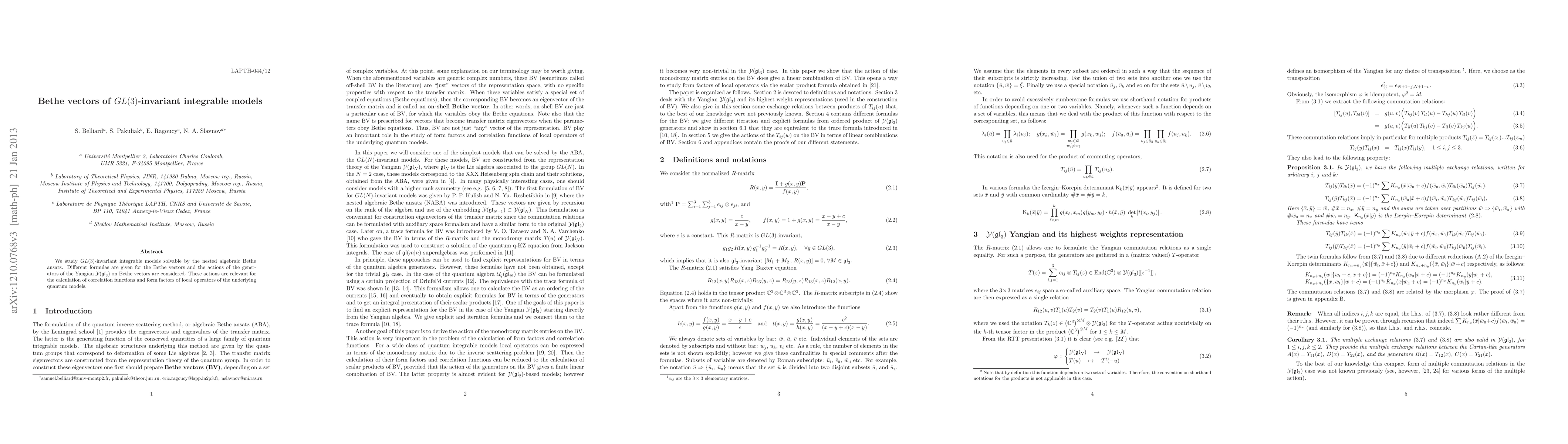 This paper investigates SU(3)-invariant integrable models using nested algebraic Bethe ansatz, providing formulas for Bethe vectors and the actions of the Yangian Y(sl(3)) generators on these vectors, which are crucial for computing correlation functions and form factors in quantum models.