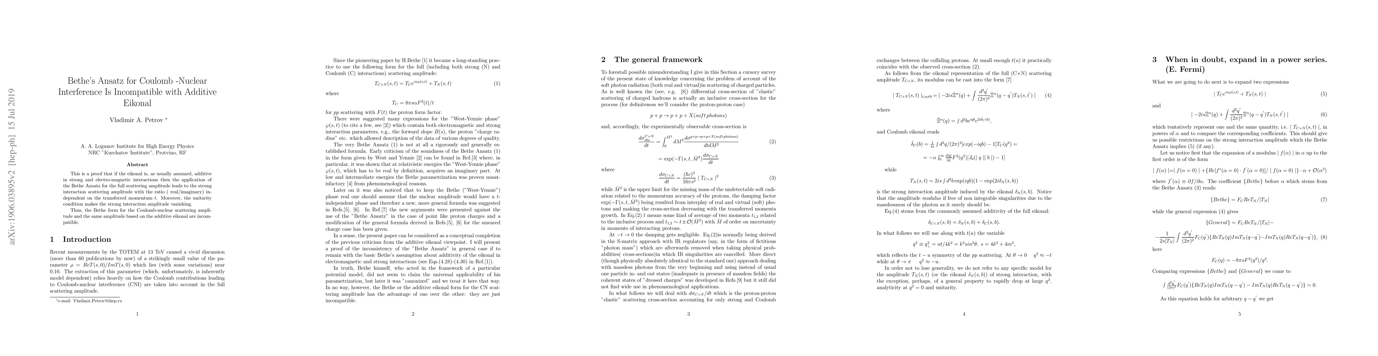 This is a proof that if the eikonal is, as usually assumed, additive in strong and electro-magnetic interactions then the application of the Bethe Ansatz for the full scattering amplitude leads to the strong interaction scattering amplitude with the ratio ( real/imaginary) independent on the transferred momentum $ t $. Moreover, the unitarity condition makes the strong interaction amplitude vanishing. Thus, the Bethe form for the Coulomb-nuclear scattering amplitude and the same amplitude based on the additive eikonal are incompatible.