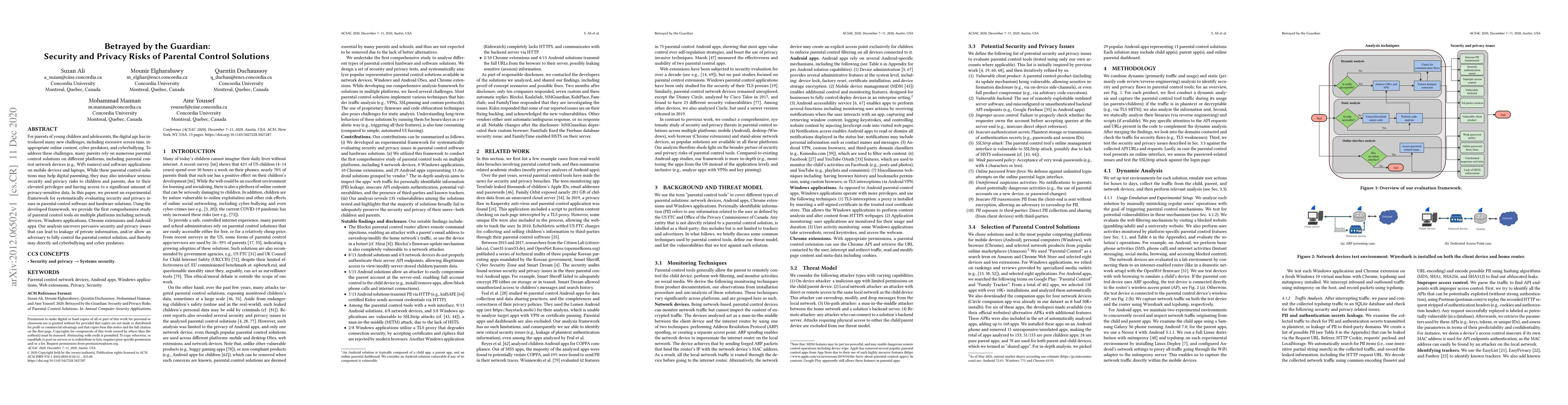 This paper investigates the security and privacy risks associated with parental control solutions used to manage children's online activities. It highlights the potential vulnerabilities in these tools, which can lead to privacy breaches and increased risks from cyberbullying and predators. For detailed insights, it is recommended to refer to the original study for a comprehensive analysis.