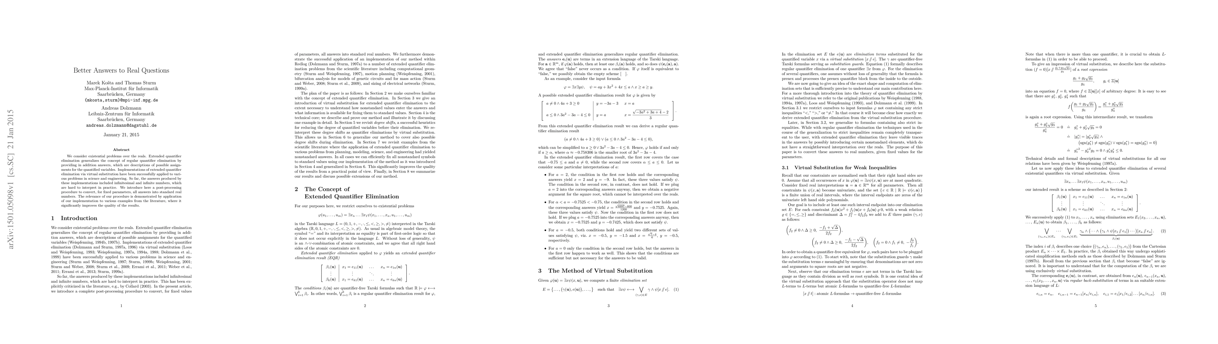This paper introduces a post-processing method to convert answers from extended quantifier elimination into standard real numbers, improving interpretability. The method is demonstrated to enhance the quality of results in various scientific and engineering applications.