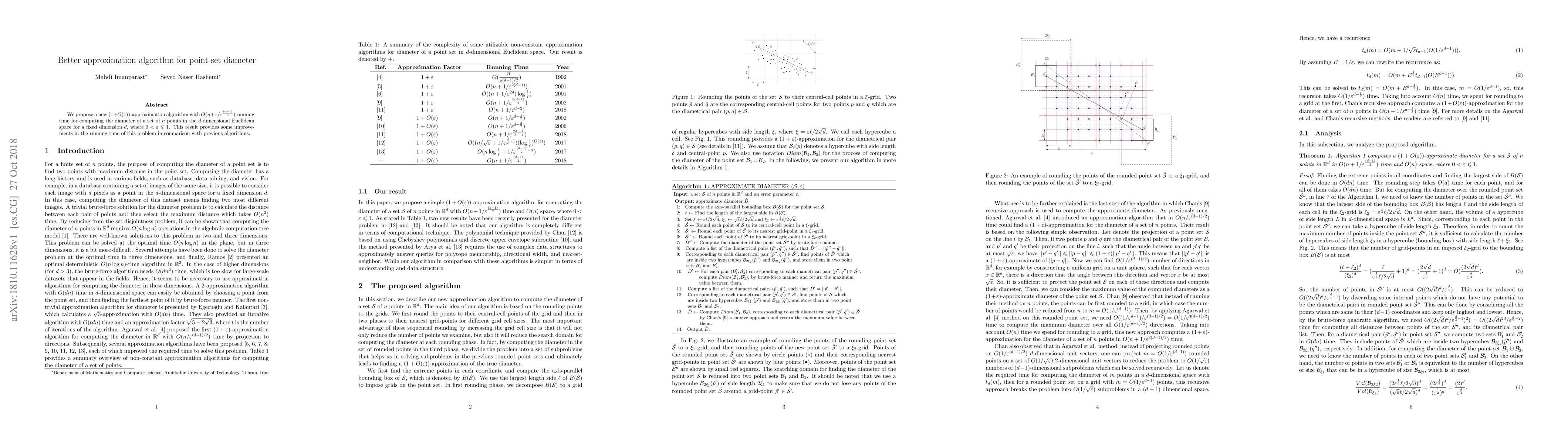 The paper introduces a novel algorithm for estimating the diameter of a point set in d-dimensional Euclidean space, providing a (1+O(ε))-approximation with a time complexity of O(n + 1/ε^(d-1)/2). This approach outperforms prior algorithms in terms of running time for fixed dimension d.